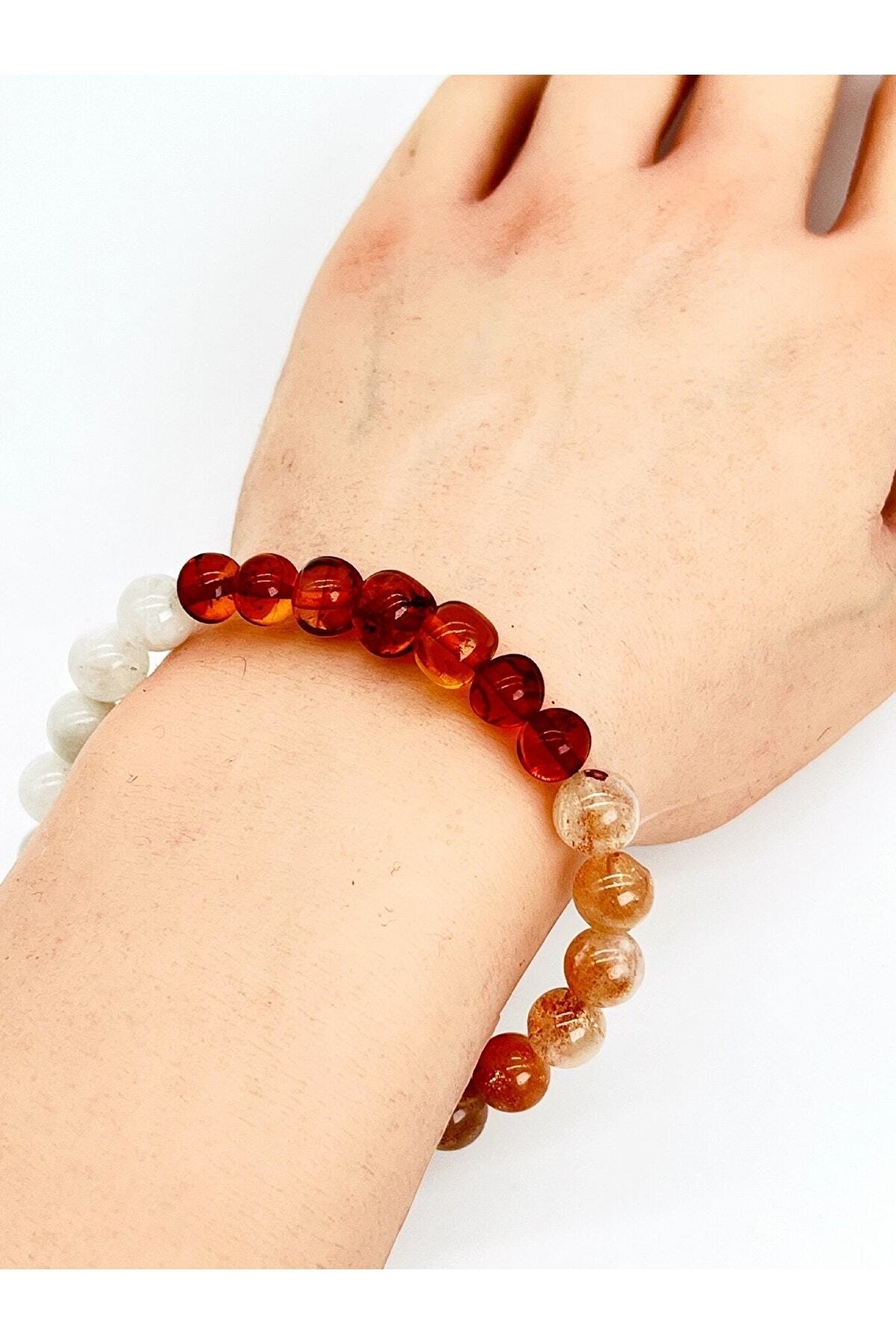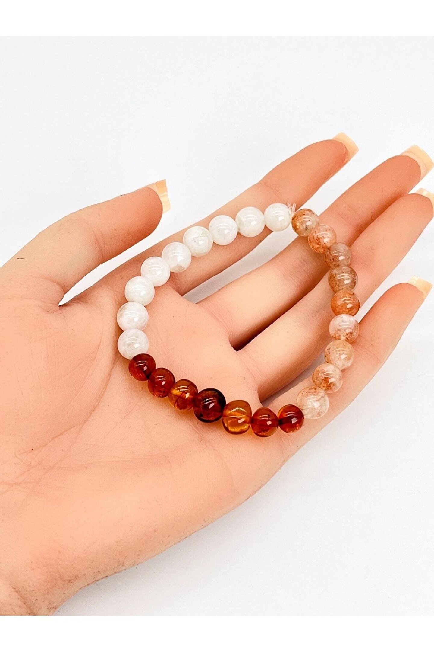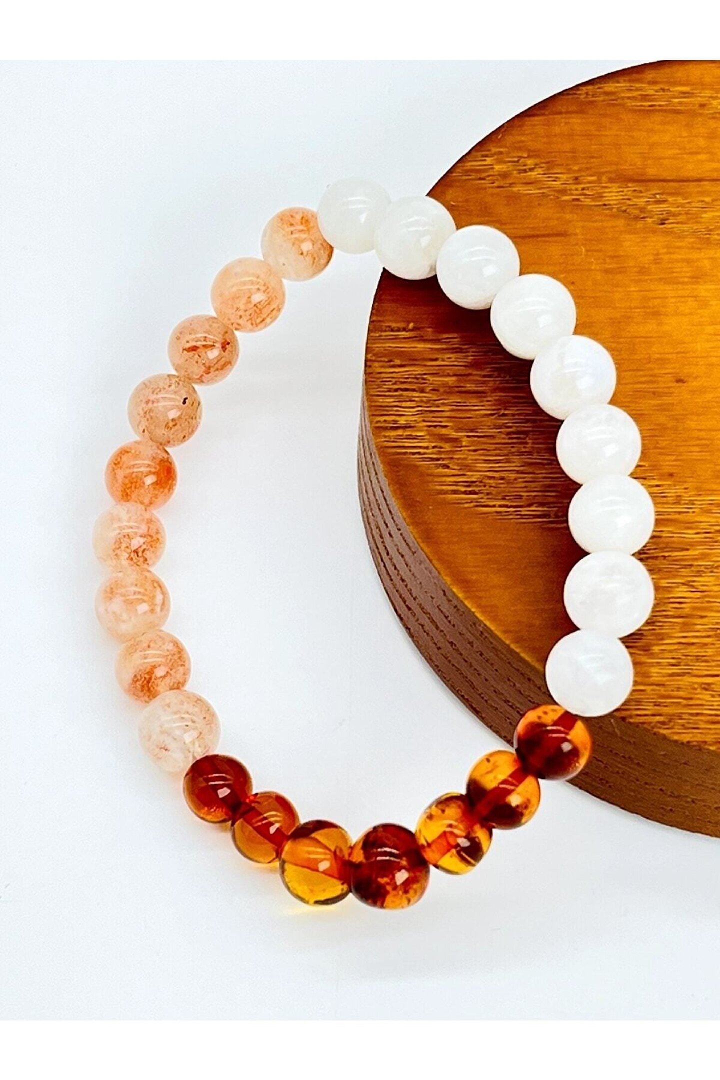 Doğal kehribar ve ay taşı kullanılarak tasarlanmış, her biri benzersiz ve özgün bir görünüm sunar; Güneş taşı ile zenginleştirilmiş bileklik, enerjiyi pozitif yönde kanalize eder ve şıklığıyla dikkat çeker; 8 mm kalınlığındaki bileklik, hem rahat bir kullanım sağlar hem de zarif bir aksesuar olarak öne çıkar; Sertifikalı kehribar ve ay taşı kullanımı, ürünün kalitesini ve orijinalliğini garanti eder;