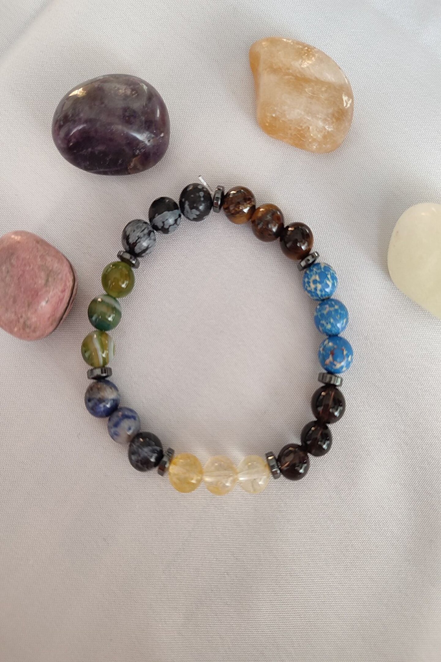 Doğal taş bileklik, şıklığınızı tamamlayacak zarif bir aksesuardır; Sertifikalı obsidyen, yeşil akik, sodalit, sitrin, dumanlı kuvars, varasit ve kaplan gözü gibi farklı türlerdeki doğal taşlarla üretilmiştir; Her bir bileklik, benzersiz ve otantik bir görünüm sunar, günlük kullanım için idealdir; Doğal taşların enerjik özellikleri sayesinde, bilekliğinizle pozitif bir enerji yayabilirsiniz;
