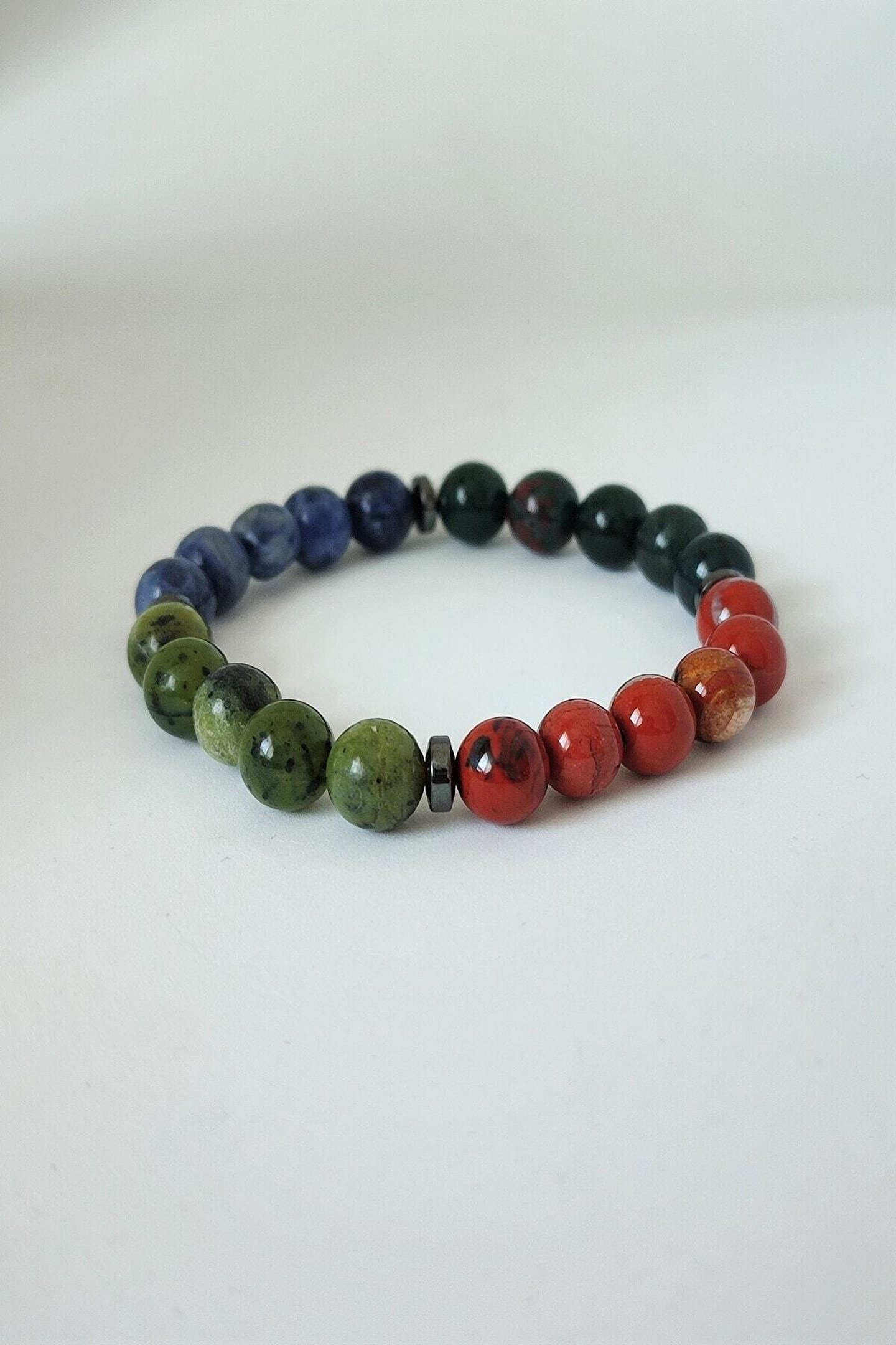 Doğal taş kullanımı sayesinde her bileklik benzersiz ve otantik bir görünüm sunar; Sertifikalı yeşim, kan taşı, sodalit ve kırmızı jasper gibi değerli taşlarla tasarlanmıştır, bu da bilekliğin hem estetik hem de sembolik bir anlam taşımasını sağlar; Doğal taş materyali ile üretilmiş olup, dayanıklılığı ve şık tasarımıyla dikkat çeker;