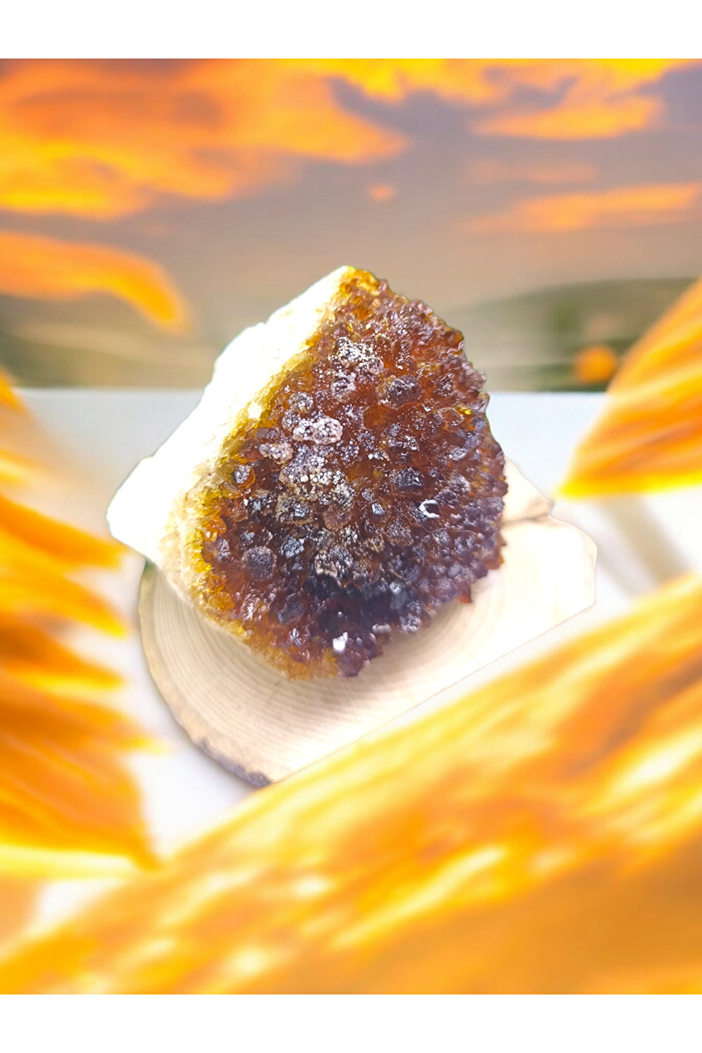 Doğal taş materyali ile üretilmiş, doğanın saf güzelliğini evinize taşıyan bir dekoratif obje; Tek parça halinde sunulan bu ürün, minimalist ve şık tasarımıyla dikkat çeker; Sertifikalı ve kaliteli bir ürün olup, Sitrin jeot ham doğal taş mineralinin özgün özelliklerini yansıtır; Para taşı olarak da bilinen Sitrin, zenginlik ve refah getirdiğine inanılan bir bereket taşıdır;