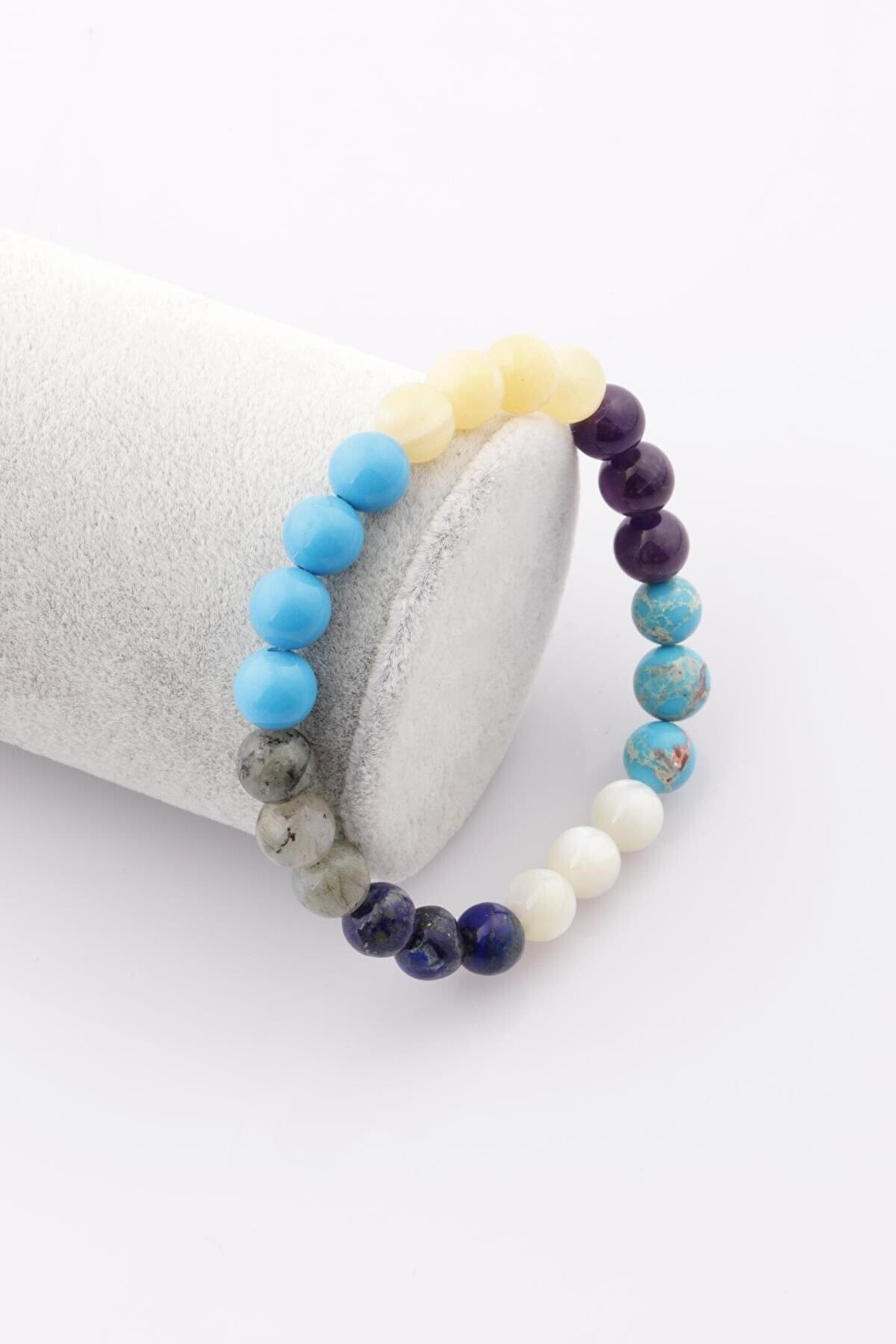 Yay Burcu Taşlarından Oluşan Doğal Taş Bileklik 8 mm Küre Kesim - Burç Bilekliği Tane Boyu 8 mm.; ; Ağırlık 18 gr.; ; Uzunluk 18 cm.; ; Esnek Lastik Misinaya Dizilmiştir Her Bileğe Uyum Sağlar.; ; Yay Burcuna Uyumlu Turkuaz, Labradorit, Kalsit, Ametist, Sedef, Lapis Lazuli ve Varisit Taşlarından Oluşmaktadır.; ; Ürün Fotoğrafı Temsili Fotoğraftır, Ürünümüz Doğal Taş Olduğundan Renklerinde, Ağırlıklarında ve Boyutlarında Küçük Farklılıklar Gösterebilir.;
