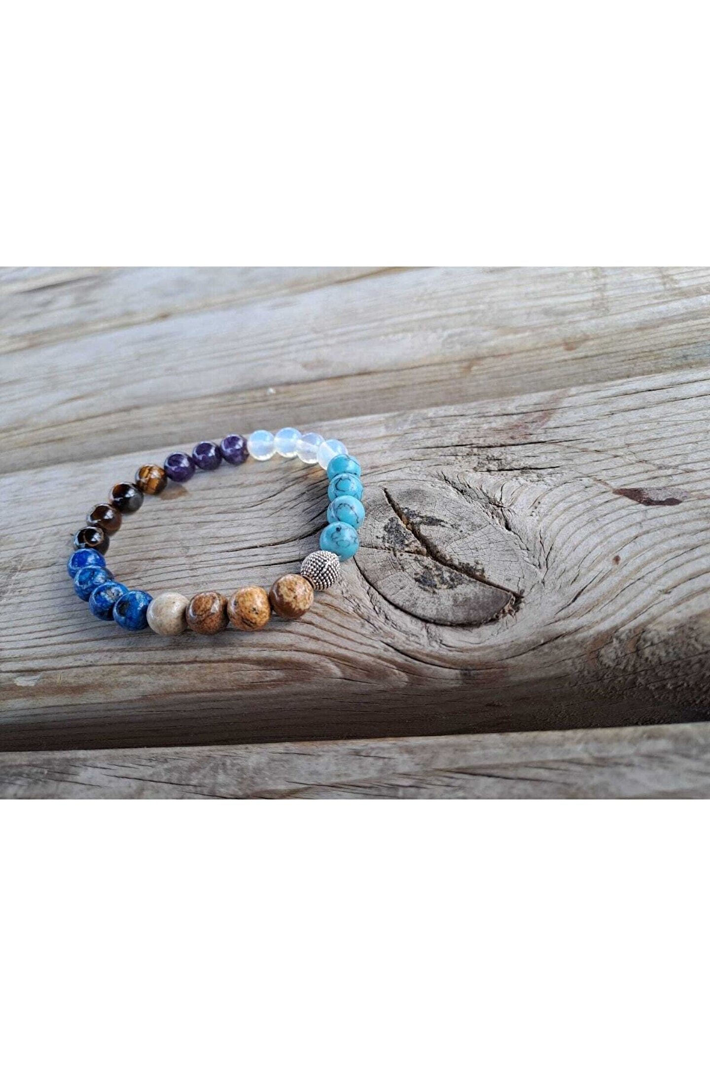 Burç bilekliklerimiz , geleneksel kabul edilen ve birbiri ile uyumlu burç taşlarından oluşturulmuşlardır.; ; Kullanılan Taşlar : Akik, Firuze, Kaplangözü, Aytaşı, Amatist, Sodalit ; Ürünlerimiz doğal taşlar kullanılarak hazırlanmaktadır.; Bilekliğimiz standart 18 cm olarak hazırlanıp, yedek lastikli misina gönderilmektedir.; ; Tane Eni: 8mm Tane Boyu: 8mm Tane Kesimi: Küre Kesim ; Ürünlerimiz doğal taş olması sebebi ile renk ve desenlerde farklılık gösterebilir.; ;