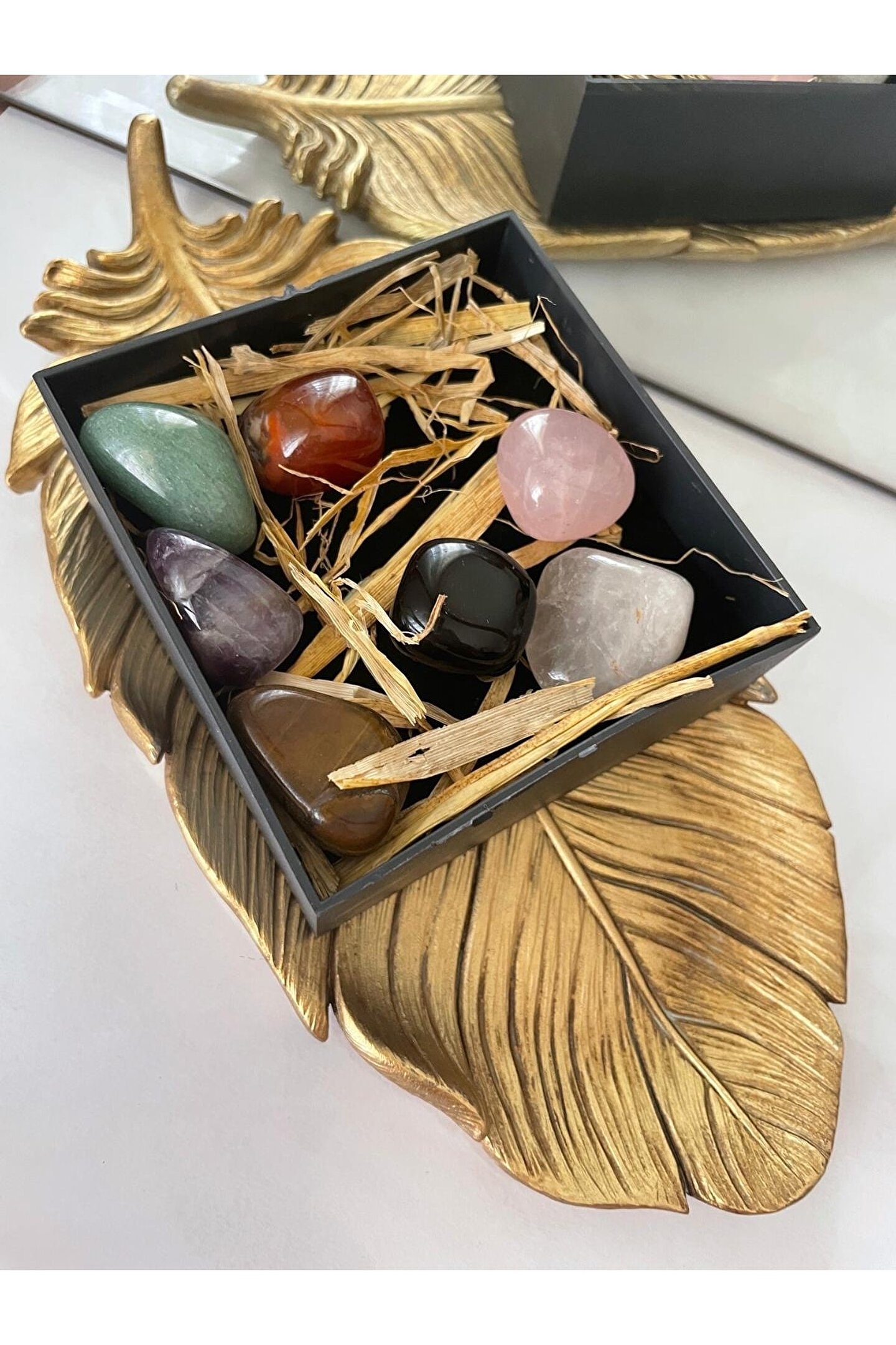 (GÖRSELDE YER ALAN TOPLAM YEDİ ADET TAŞ GÖNDERİLECEKTİR, SETİN TOPLAM AĞIRLIĞI 140-150 GRAM ARASINDA DEĞİŞMEKTEDİR YANİ TAŞ BAŞINA ORTALAMA 20 GRAM BANDINDADIR. ; TAŞLAR GERÇEK DOĞAL TAŞ OLUP ŞEKİLSEL OLARAK DEĞİŞİKLİK GÖSTEREBİLİR. ; ÜRÜN GÖNDERİMİ GÖRSELDE MEVCUT OLAN ÖZEL SİYAH KUTU İÇERİSİNDE YAPILACAKTIR.) -----İÇİNDEKİLER----- -Ametist -Pembe Kuvars -Oniks -Kaplan gözü -Aventurin -Kristal Kuvars -Akik Bütün çakraları açarak kişinin fiziksel ve zihinsel durumunu dengede tutar. ; Kişiyi huzurlu ve mutlu hissettirir. ; Kişiyi motive eder ve hayatı sevmesini sağlar. ; Taşların enerjisini temizlemek için akan suda yıkamanız ya da toprağın altında 24 saat boyunca bekletmeniz yeterli olacaktır. ; TÜM ÜRÜNLER AYSHO DOĞAL TAŞ KALİTESİ KAPSAMINDA SERTİFİKASIYLA BERABER GÖNDERİLMEKTEDİR.;