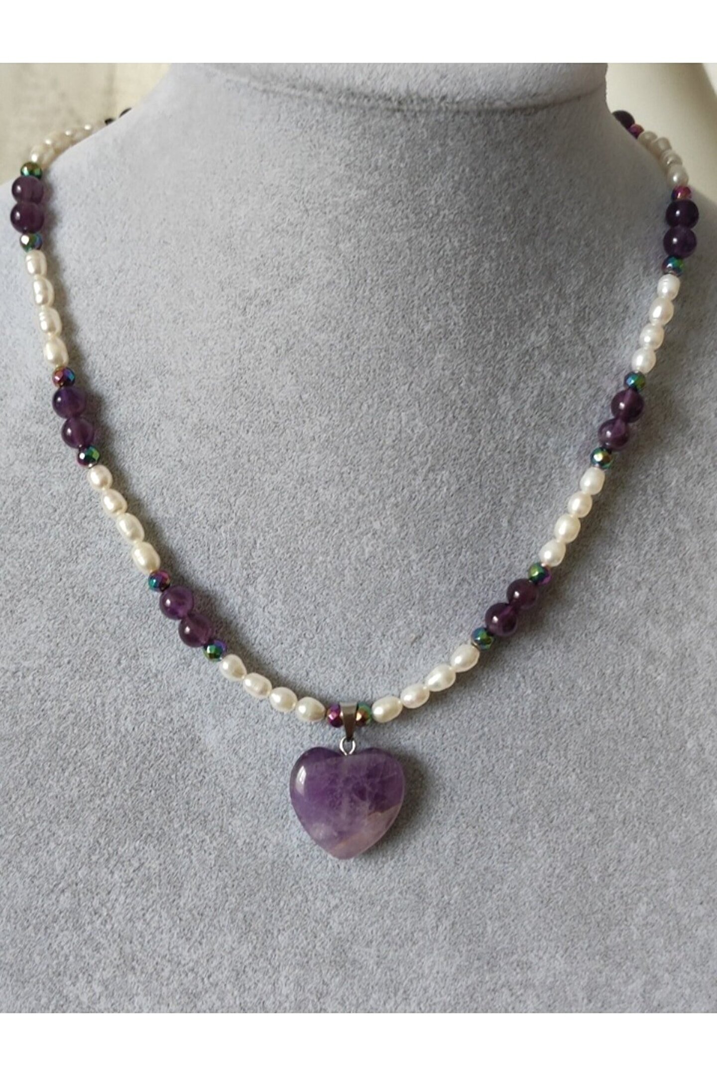 - Zarif tasarımıyla dikkat çeken bu kolye, kalpli ametist ve arpa minimal inci detaylarıyla şıklığınızı tamamlar; - Doğal tatlı su incisi kullanılarak üretilmiş olup, her bir inci özenle seçilmiş ve kolyenin genel estetiğine katkıda bulunmuştur; - Minimalist tasarımıyla günlük kullanımda rahatlıkla tercih edilebilen bu kolye, sade ve zarif görünümüyle her türlü kıyafetle uyum sağlar;
