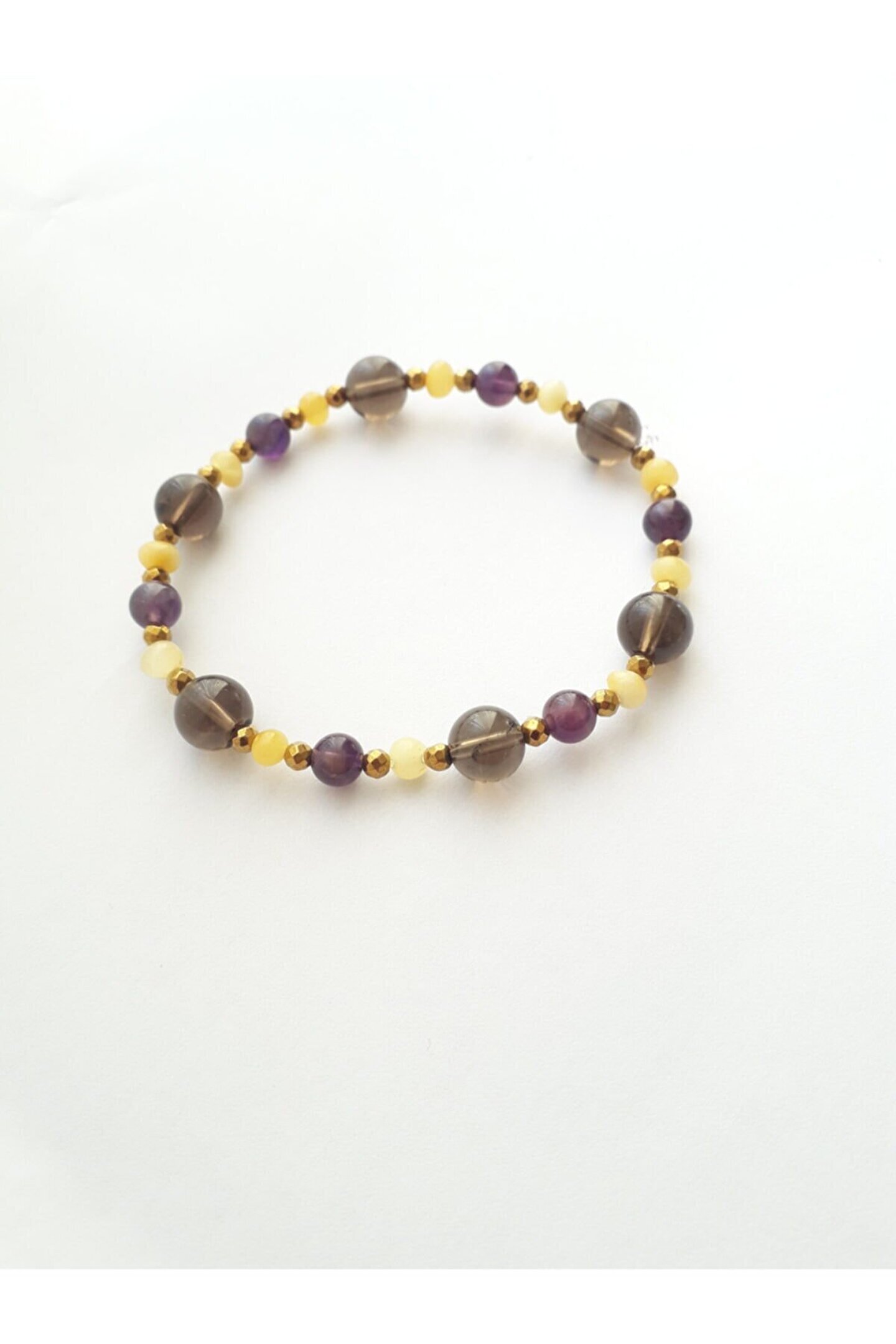 Doğal kehribar taşı kullanılarak üretilmiş, şık ve zarif bir tasarıma sahip; Negatif enerjiyi uzaklaştırarak pozitif enerjiyi artırma özelliği ile günlük kullanım için ideal; El yapımı ve özgün tasarımıyla dikkat çeken bu bileklik, her kıyafetle uyum sağlar; Doğal taş materyali sayesinde her parça benzersiz ve eşsiz bir görünüm sunar;