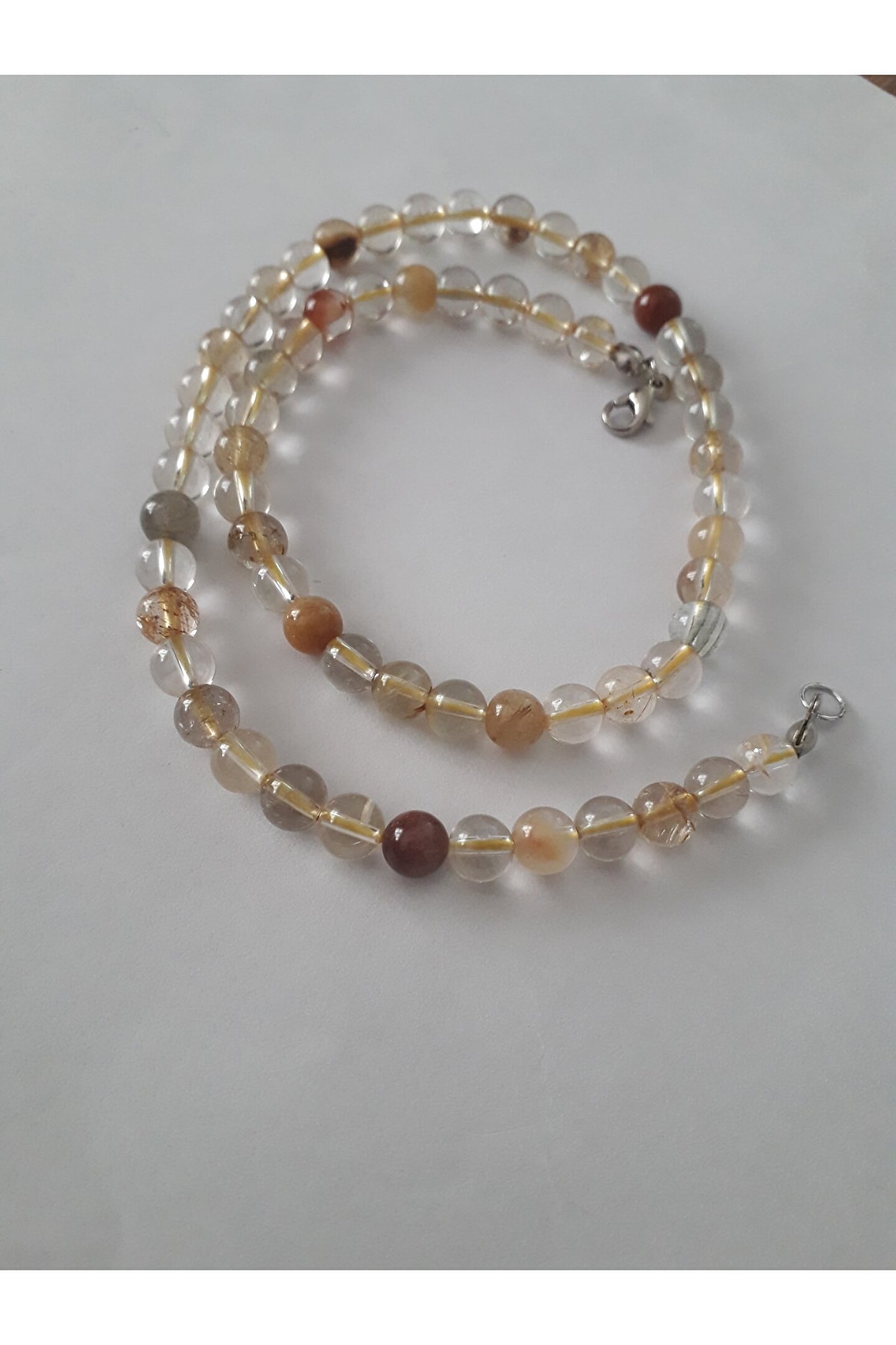 Doğal taş kullanımı sayesinde her kolye benzersiz ve otantik bir görünüm sunar; Rutil kuvars taşı, kolyenin hem şık hem de zarif bir dokunuş katmasını sağlar; 6 mm boyutu, klasik ve zamansız bir tasarım arayanlar için idealdir; Taş materyali, dayanıklılığı ve uzun ömürlü kullanımı garanti eder;