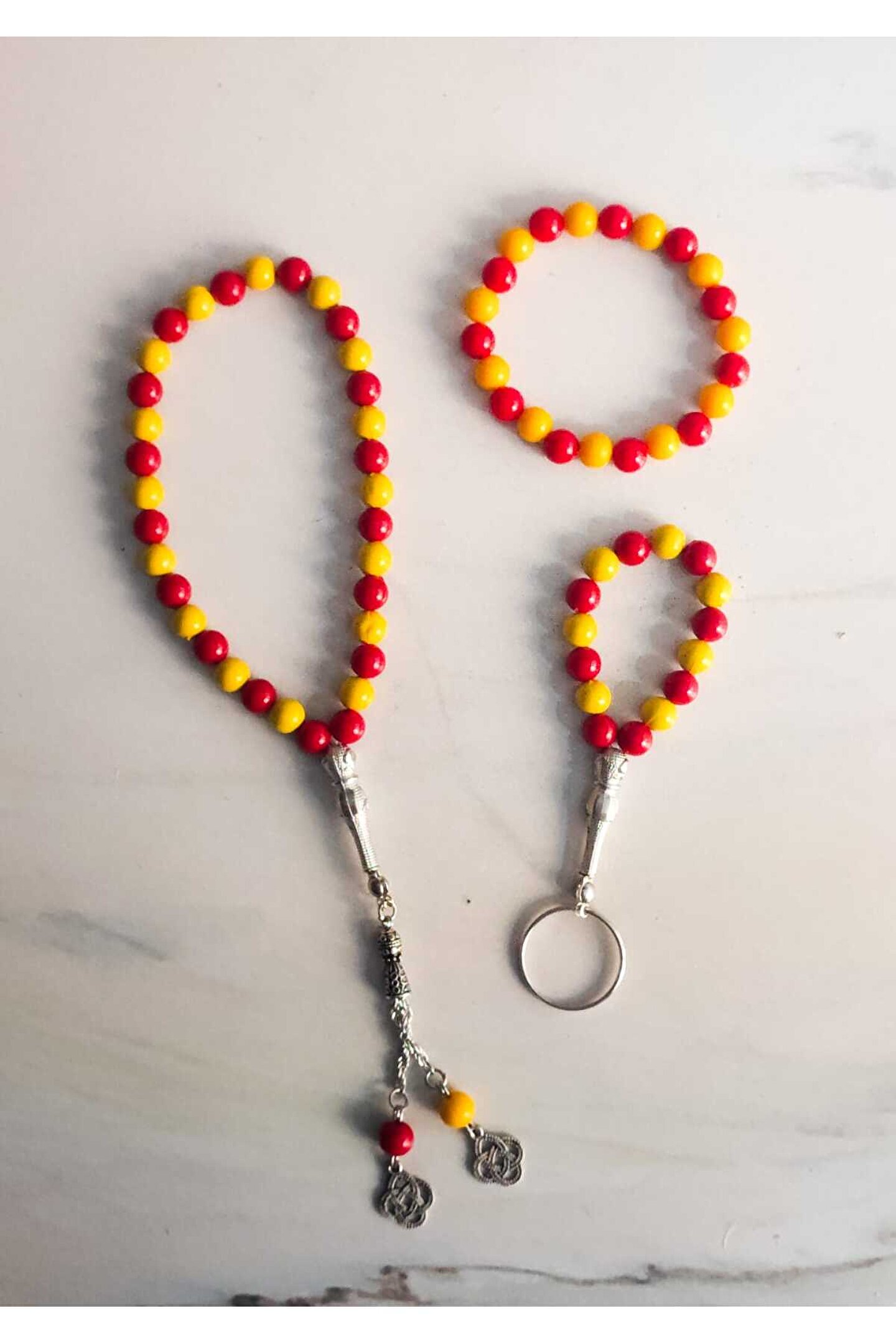 - Zarif tasarımıyla dikkat çeken sarı-kırmızı renklerdeki üçlü set, hem günlük kullanım hem de özel günler için idealdir.; - Tesbih, bileklik ve anahtarlık olmak üzere üç farklı parçadan oluşan bu set, her bir aksesuarla uyumlu bir görünüm sunar.; - Hem şıklığı hem de fonksiyonelliği bir arada barındıran bu set, kişisel tarzınızı tamamlamanız için mükemmel bir seçenektir.; - Kaliteli malzemelerden üretilmiş olan bu ürünler, uzun süreli kullanım için dayanıklılık vaat eder.; - Hediye olarak tercih edebileceğiniz bu üçlü set, sevdiklerinize anlamlı ve özgün bir hediye alternatifi sunar.