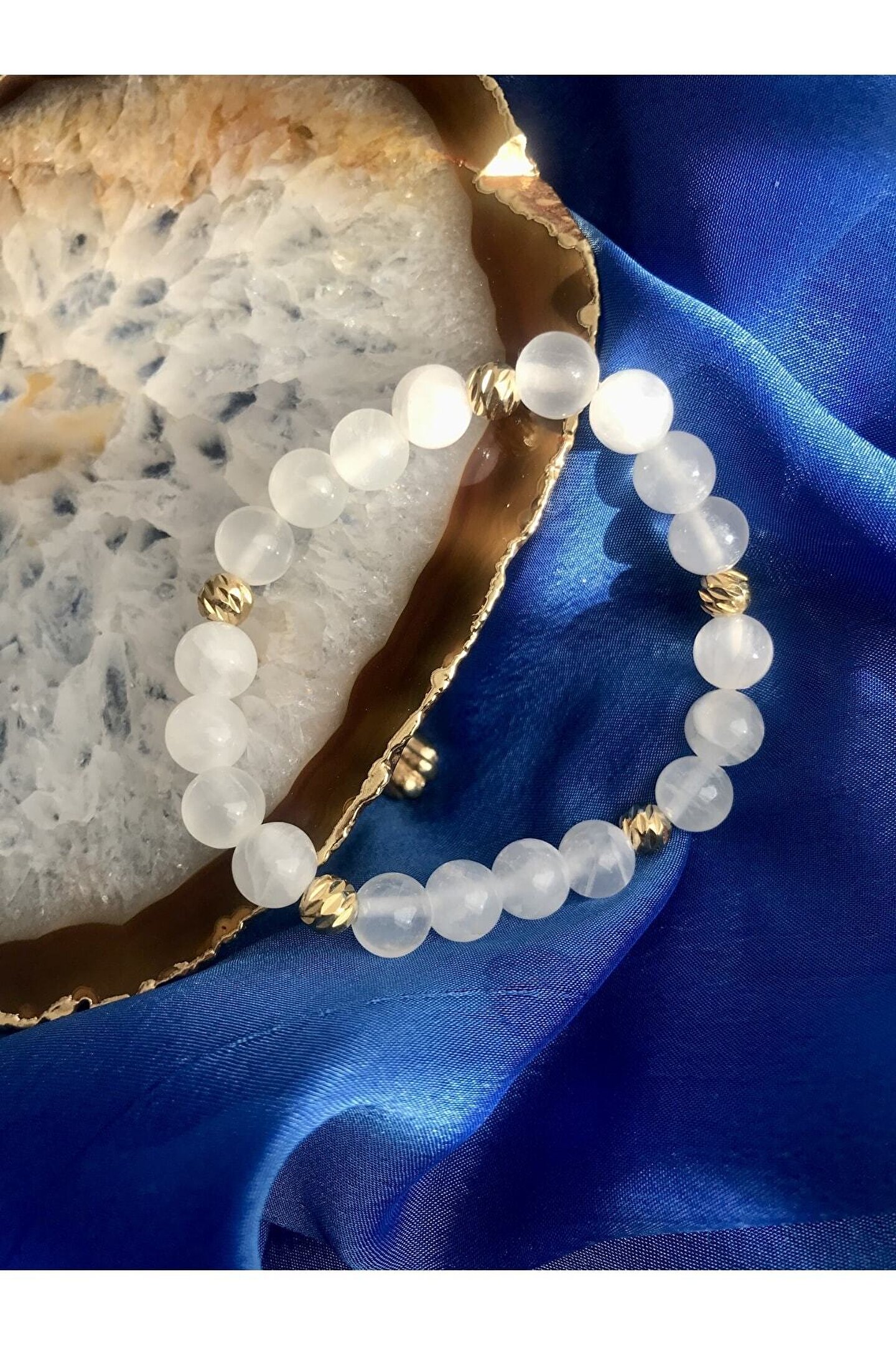 8 mm selenit şık bileklik.lastikli misinededir.altın kaplama toplarla süslenmiştir