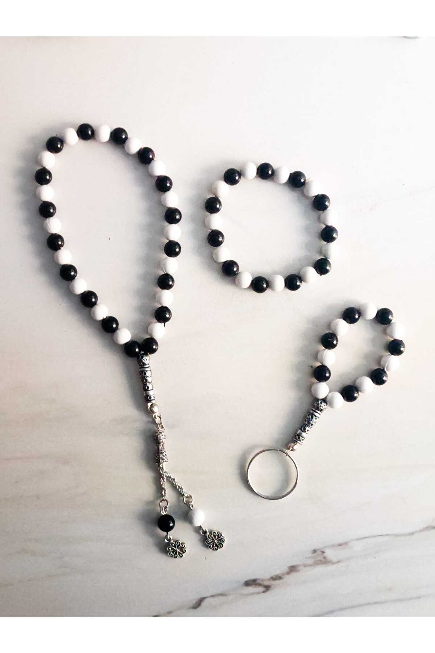 - Siyah-beyaz renk kombinasyonu ile şıklığı ve zarafeti bir arada sunan üç parçalı set.; - Her bir bileşen, günlük kullanım için ideal boyutlarda tasarlanmıştır; tesbih, bileklik ve anahtarlık.; - Üçlü set, hem hediye olarak tercih edebileceğiniz hem de kişisel kullanımınızda rahatlıkla taşıyabileceğiniz pratik bir aksesuar seçeneği sunar.; - Tesbihin zarif tasarımı, bilekliğin konforlu yapısı ve anahtarlığın fonksiyonelliğiyle her an yanınızda olacak bir stil oluşturur.