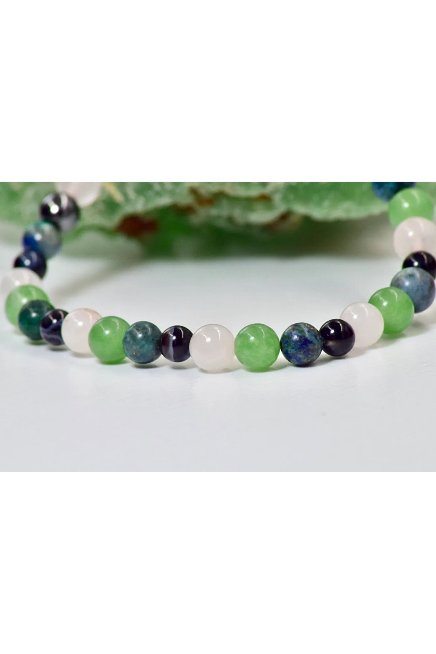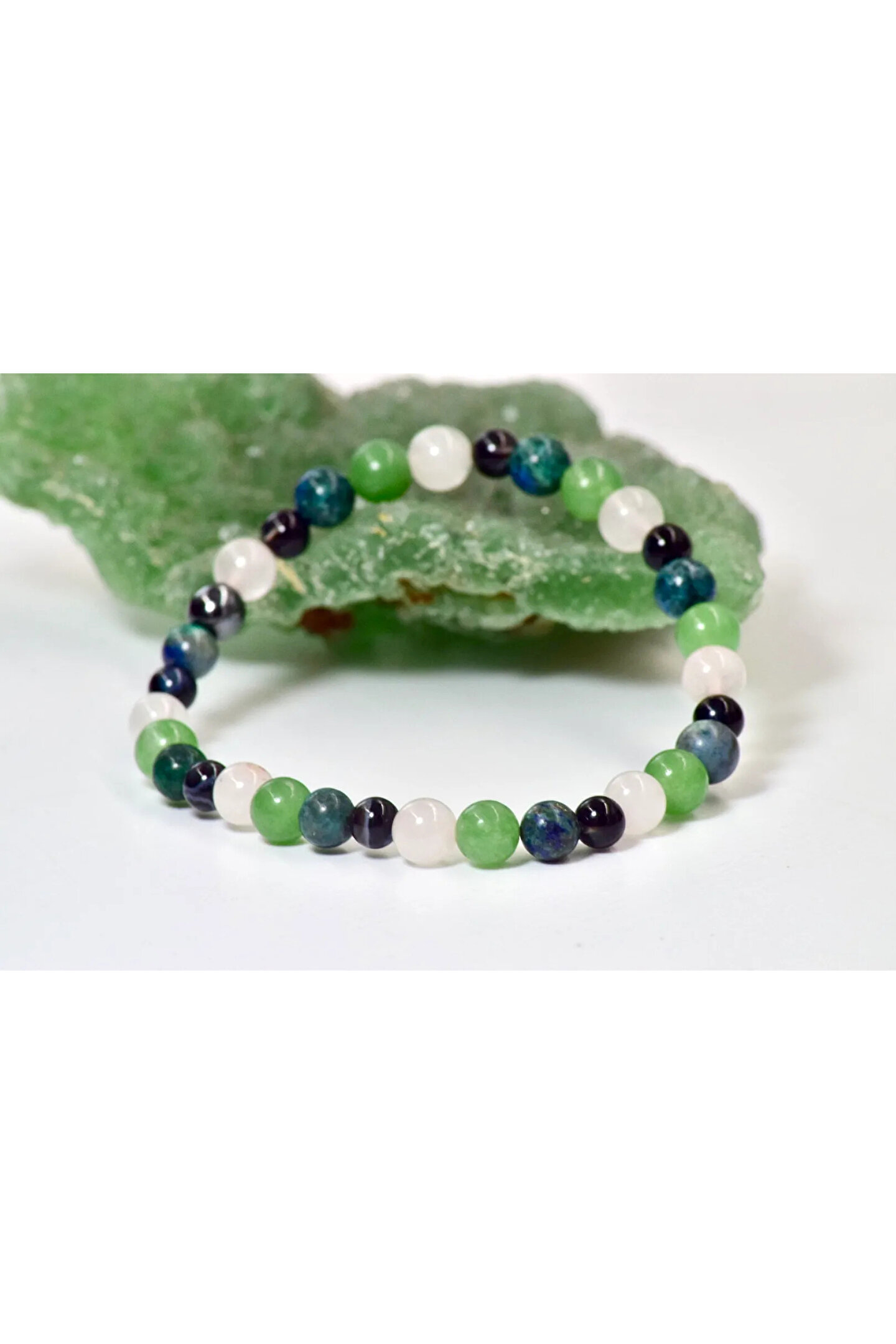 Azurit, Pembe Kuvars, Aventurin ve Akik ile birlikte çalışarak; hem içsel sarsıntıları sakinleştirir, hem de fiziksel alanında denge ve topraklanma sağlar.