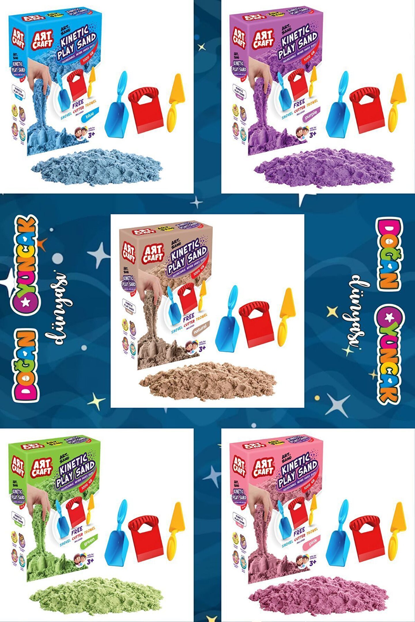 Doğan Oyuncak Dünyası yepyeni ve çok kaliteli bir set ile yine karşınızda! ; Bu sette yok, yok! ; Bu set 5 ayrı renkli kumdan oluşmaktadır. ; Her renk ayrı bir kutuda gelmektedir. ; Set tam 5 ayrı üründen oluşmaktadır. ; Her ürün ayrı bir paket ile gelmektedir. ; Bu kinetik kum seti çok zevkli ve çok eğlenceli ; Çocukların azıcık bile kum sevgisi var ise, bu set o çocuk için bir harika. ; Görseldeki tüm setler bir paket içerisinde gelecektir. ; Bu harika seti kim istemez ki? ; Her pakette 1000 gr. kinetik kum bulunmaktadır. Yani Toplam 5 kg. kinetik kum olacak. ; Görseldeki tüm aksesuarlar paketlerin içinde bulunmaktadır. ; Kinetik kumların kesinlikle sağlığa zararları yoktur. ; CE Standartlarına uygun olarak üretilmiştir. ; Kinetik Kum Özellikleri: Kinetik kum kesinlikle kurumaz, tek yapmamanız gereken şey ıslak elle oynamamak. ; Tüm setin, tüm parçaları Türkiye'de üretilmiştir. ; Sağlığa herhangi bir zararı yoktur. ; Paket İçeriği: ; Aksesuarlı Naturel Kinetik Oyun Kumu 1000 gr ; Aksesuarlı Pembe Kinetik Oyun Kumu 1000 gr ; Aksesuarlı Mor Kinetik Oyun Kumu 1000 gr ; Aksesuarlı Yeşil Kinetik Oyun Kumu 1000 gr ; Aksesuarlı Mavi Kinetik Oyun Kumu 1000 gr ;