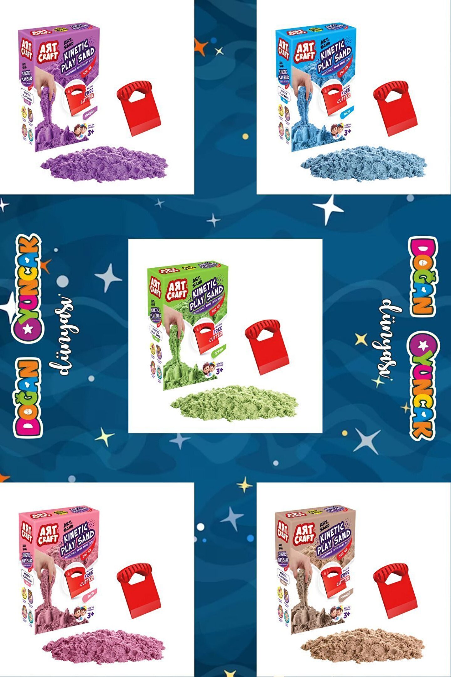 Doğan Oyuncak Dünyası yepyeni ve çok kaliteli bir set ile yine karşınızda! ; Bu sette yok, yok! ; Bu set 5 ayrı renkli kumdan oluşmaktadır. ; Her renk ayrı bir kutuda gelmektedir. ; Set tam 5 ayrı üründen oluşmaktadır. ; Her ürün ayrı bir paket ile gelmektedir. ; Bu kinetik kum seti çok zevkli ve çok eğlenceli ; Çocukların azıcık bile kum sevgisi var ise, bu set o çocuk için bir harika. ; Görseldeki tüm setler bir paket içerisinde gelecektir. ; Bu harika seti kim istemez ki? ; Her pakette 500 gr. kinetik kum bulunmaktadır. Yani Toplam 2,5 kg. kinetik kum olacak. ; Görseldeki tüm aksesuarlar paketlerin içinde bulunmaktadır. ; Kinetik kumların kesinlikle sağlığa zararları yoktur. ; CE Standartlarına uygun olarak üretilmiştir. ; Kinetik Kum Özellikleri: Kinetik kum kesinlikle kurumaz, tek yapmamanız gereken şey ıslak elle oynamamak. ; Tüm setin, tüm parçaları Türkiye'de üretilmiştir. ; Sağlığa herhangi bir zararı yoktur. ; Paket İçeriği: ; Aksesuarlı Naturel Kinetik Oyun Kumu 500 gr ; Aksesuarlı Pembe Kinetik Oyun Kumu 500 gr ; Aksesuarlı Mor Kinetik Oyun Kumu 500 gr ; Aksesuarlı Yeşil Kinetik Oyun Kumu 500 gr ; Aksesuarlı Mavi Kinetik Oyun Kumu 500 gr ;