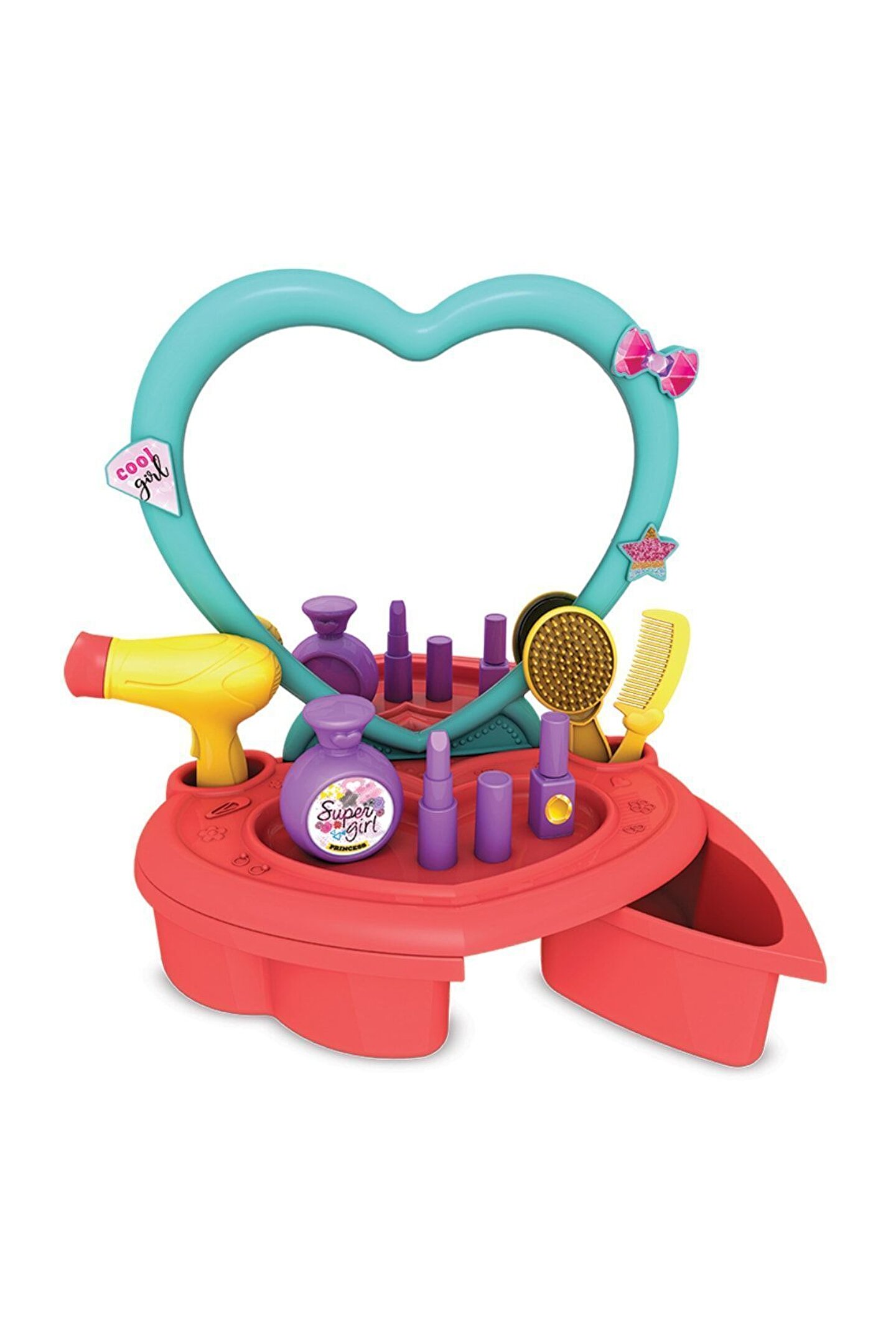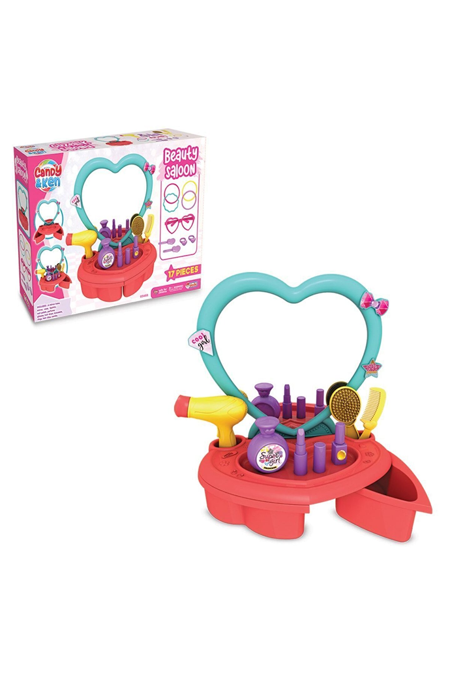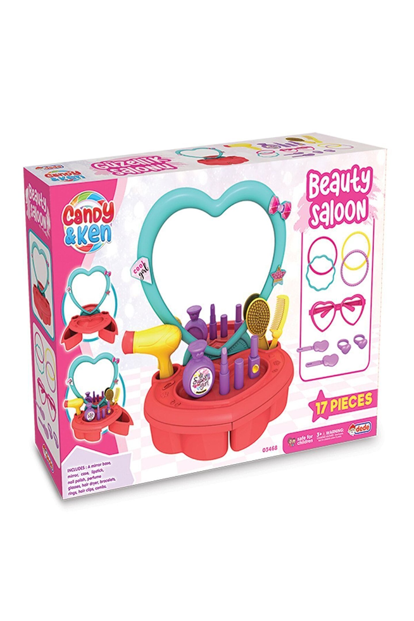 Candy & ken güzellik salonu - Güzellik setleri - Kuaför oyuncak seti Güzellik salonu birçok aksesuar içerir. Içerisindeki parçalarla değişik saç modelleri yapacaksın ve çok eğleneceksin! Ürün; 16 parçadan oluşmaktadır. Parçaları setin çekmesinde saklayabilirsin. Içerik; ayna tabanı, kendinden yapışkanlı ayna, masa, fotoğraf çerçevesi, saç kurutma makinesi, bilezikler yüzükler, tokalar, tarak ve fırça. Ürün; 3 yaş altı çocuklar için uygun değildir. Sağlık testlerinden geçmiştir.