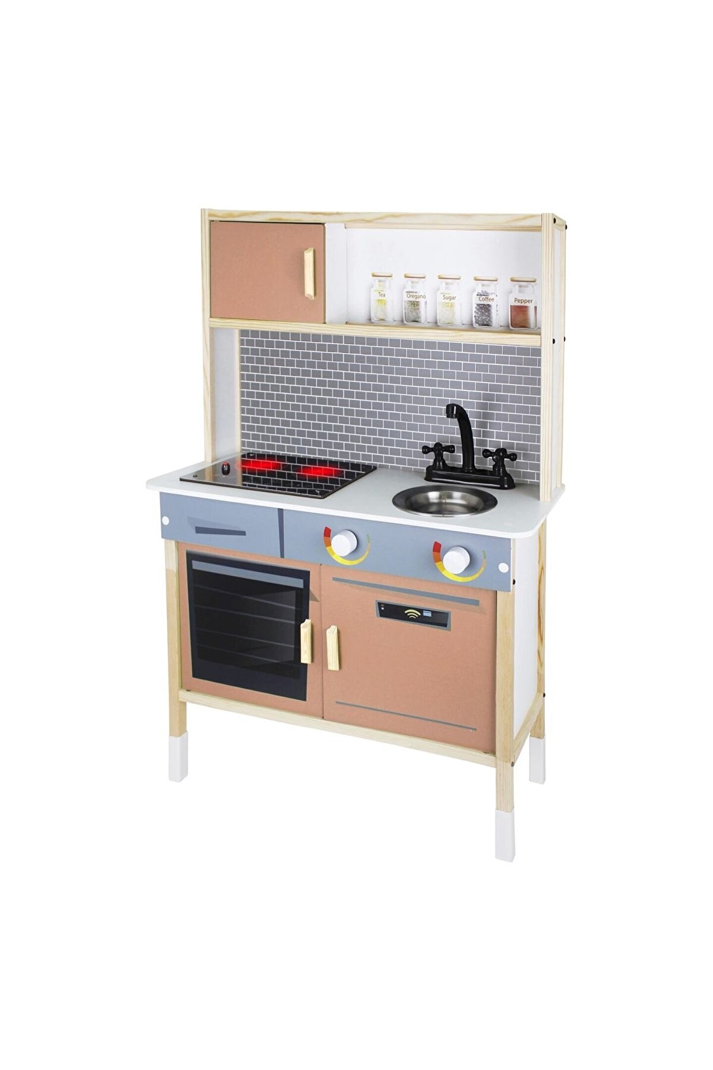 Delüx Işıklı Hamarat Ahşap Mutfak - Ahşap Çocuk Mutfağı - Mutfak Seti - Kapaklı Mutfak - Krem