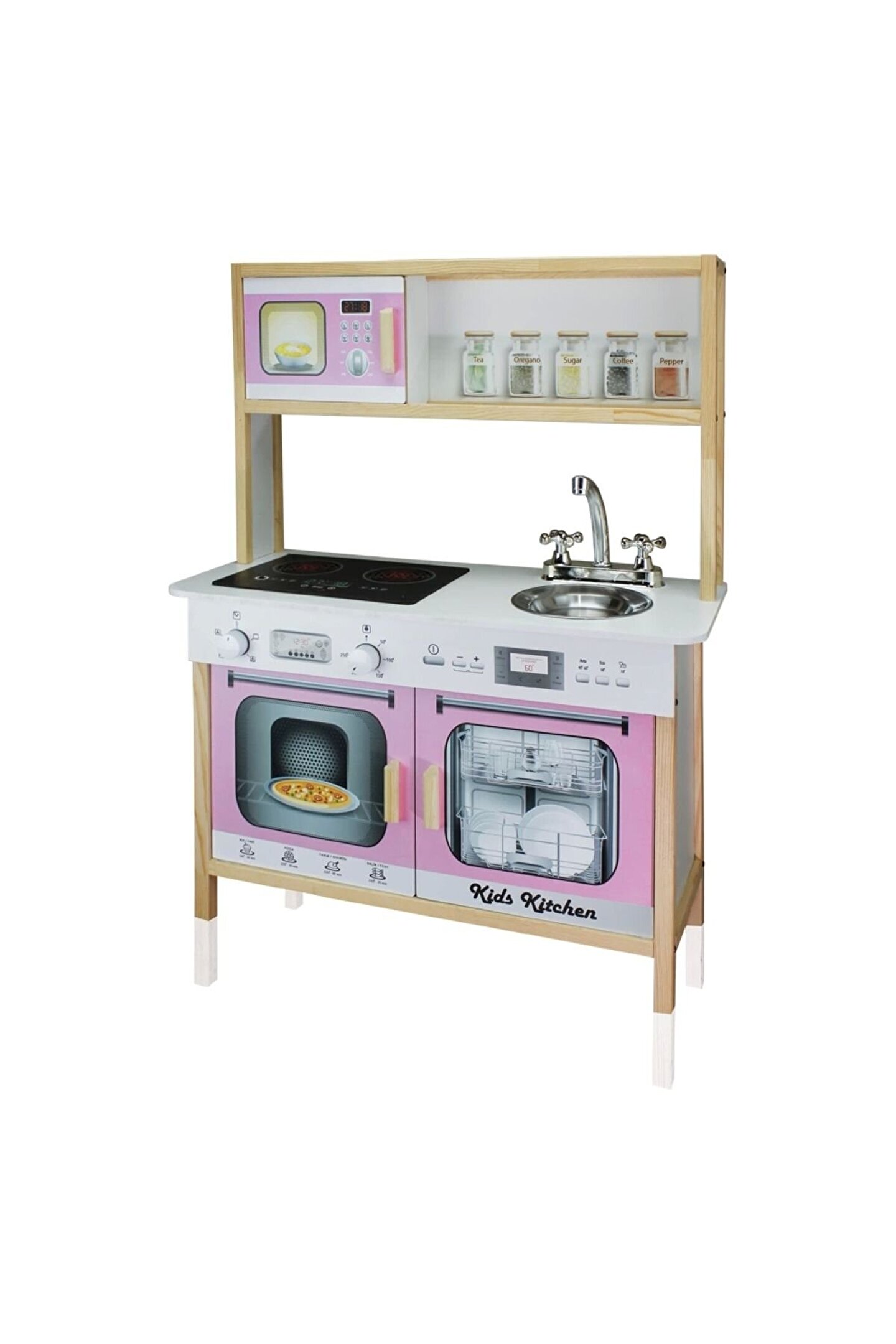 Lüx Işıklı Hamarat Ahşap Mutfak - Ahşap Çocuk Mutfağı - Mutfak Seti - Kapaklı Mutfak - Pembe