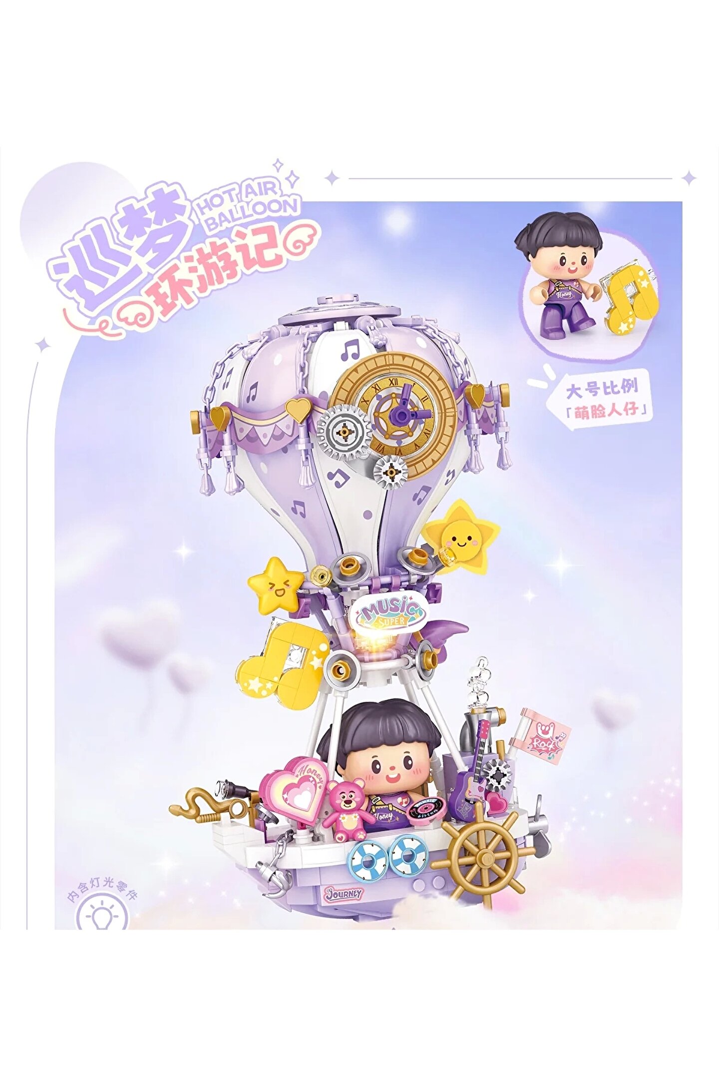 Ayrıntılı Karakter ve Aksesuarlar: Sıcak hava balonu, teleskop, hazine sandığı ve müzik notaları gibi çeşitli aksesuarlarla çevrili neşeli bir karakter taşır. Bu detaylar, modelin hikaye anlatma yönüne katkıda bulunarak hayal gücüne dayalı oyun ve yaratıcı keşiflere olanak tanır.