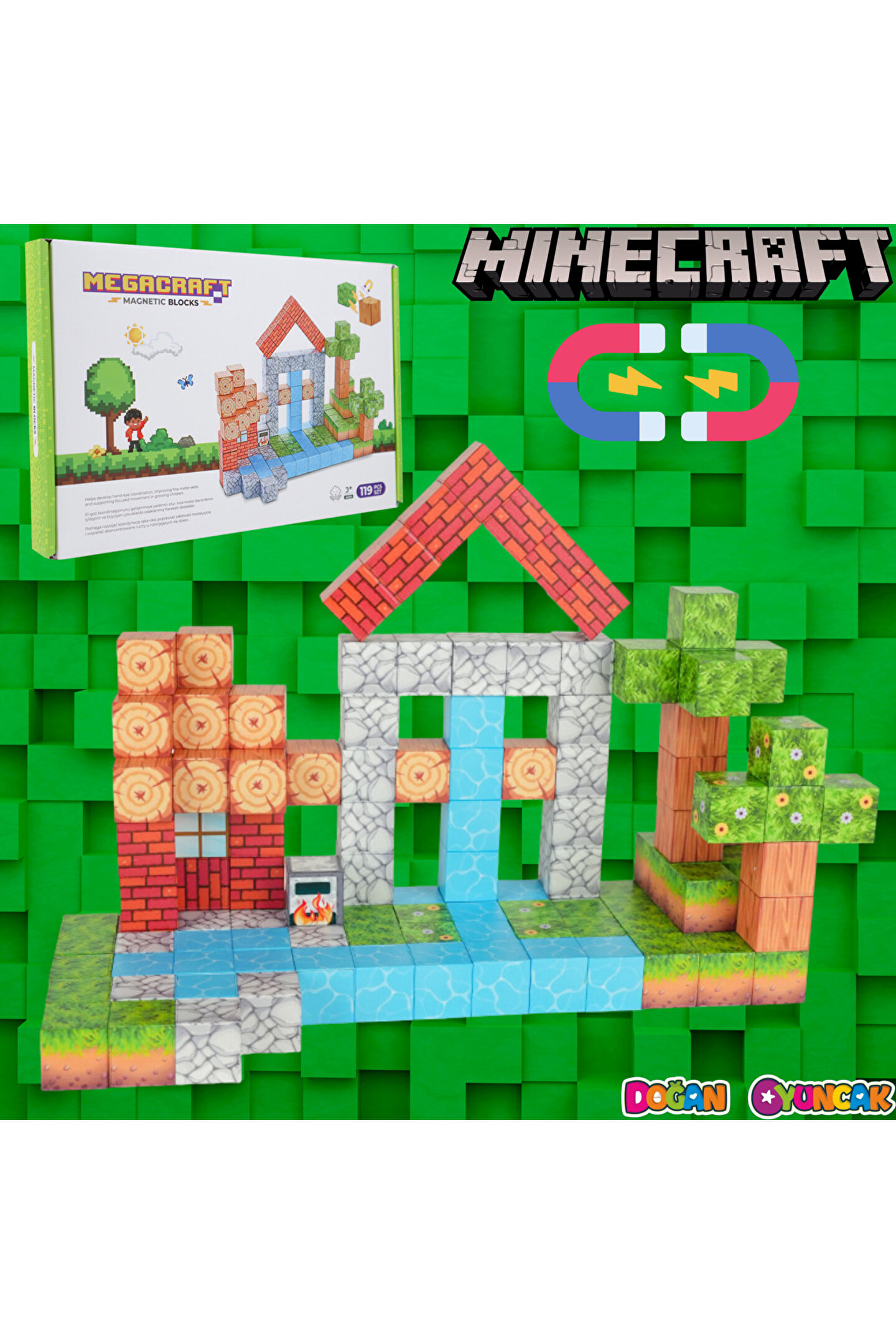 Çocukların hayal gücünü doğayla birleştiren Megacraft Manyetik Bloklar, eğlenceli ve öğretici bir oyun deneyimi sunar.; ; Orman temasından ilham alan bu set, çocukların kendi benzersiz dünyalarını oluşturmalarına olanak tanır.; Manyetik bağlantılar sayesinde kolayca birleştirilebilir ve defalarca yeniden inşa edilebilir!; Megacraft stilinde küp tasarımı mevcuttur.; ; Gerçek mıknatıslı yapılar ve kolayca birleşip dağılmaz.; ; Kaliteli, dayanıklı, güvenli malzemeden üretilmiştir.; ; Koleksiyonluk kutu ambalajına sahiptir.; ; Çocuk eğitici oyuncaklar, çocukların beyin potansiyelini uyarmak ve zekalarını geliştirmek için tasarlanmış oyuncaklardır.; Bu oyuncaklar genellikle aşağıdaki özelliklere sahiptir.; ; Birçok eğitici oyuncak, sosyal becerileri ve takım çalışmasını geliştirmek için çocukları oyuncaklarla veya diğer çocuklarla etkileşime girmeye teşvik eder.; ; Eğitici oyuncaklar, bulmacalar, yapı taşları veya sanat ve el sanatları etkinlikleri aracılığıyla çocukların hayal gücüne ve yaratıcılığına ilham verir.; ; Bazı oyuncaklar, çocukların düşünmesini ve çözmesini gerektiren belirli bulmacalar veya zorluklarla tasarlanarak mantık ve eleştirel düşünme becerilerini geliştirir.; ; 3 yaş ve üzeri içindir.; ; Parça sayısı: 119;