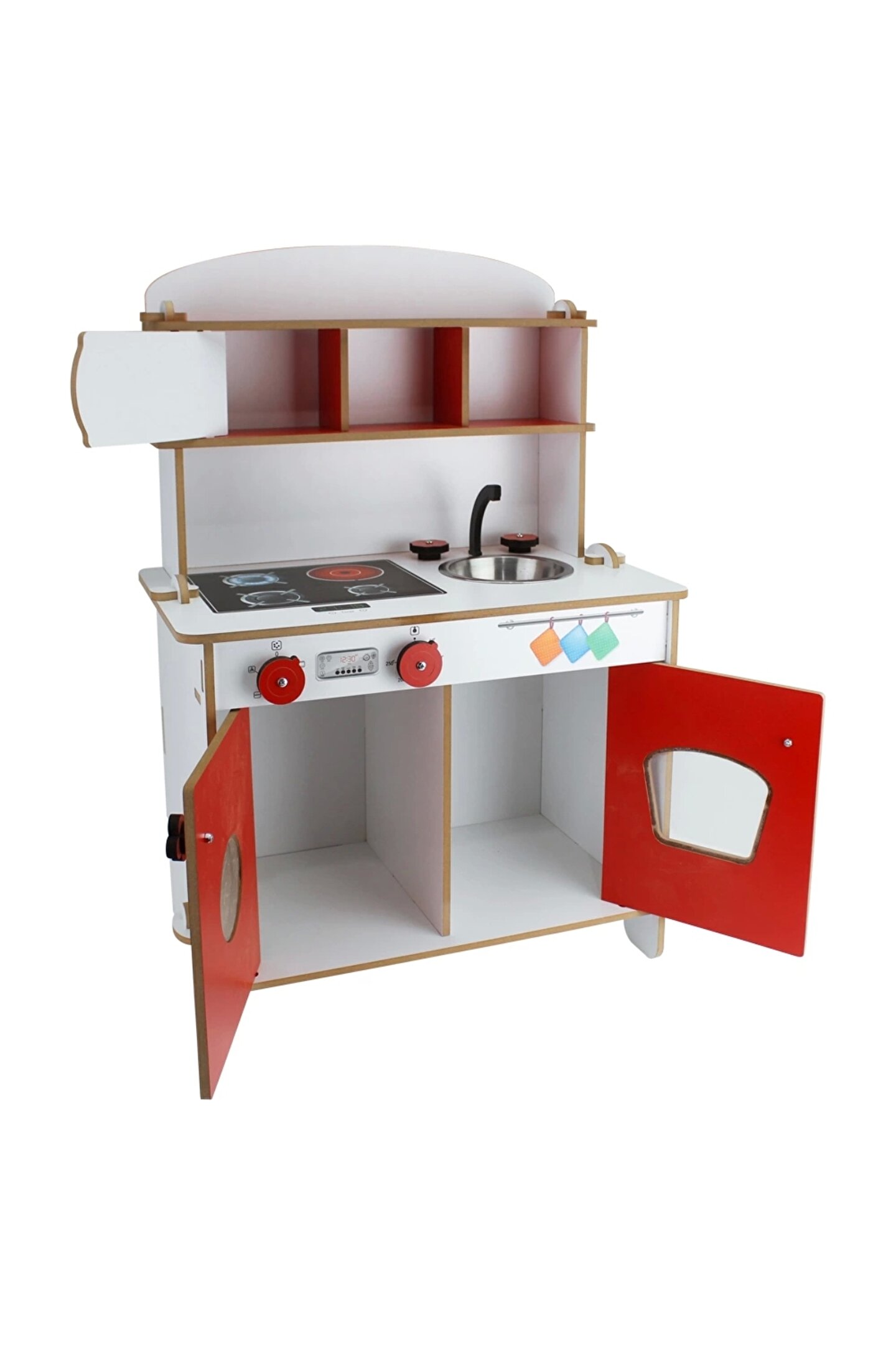 Doğan Oyuncak Dünyası Pratik Hamarat Ahşap Mutfak - Ahşap Çocuk Mutfağı - Mutfak Seti - Kapaklı Mutfak - Kırmızı