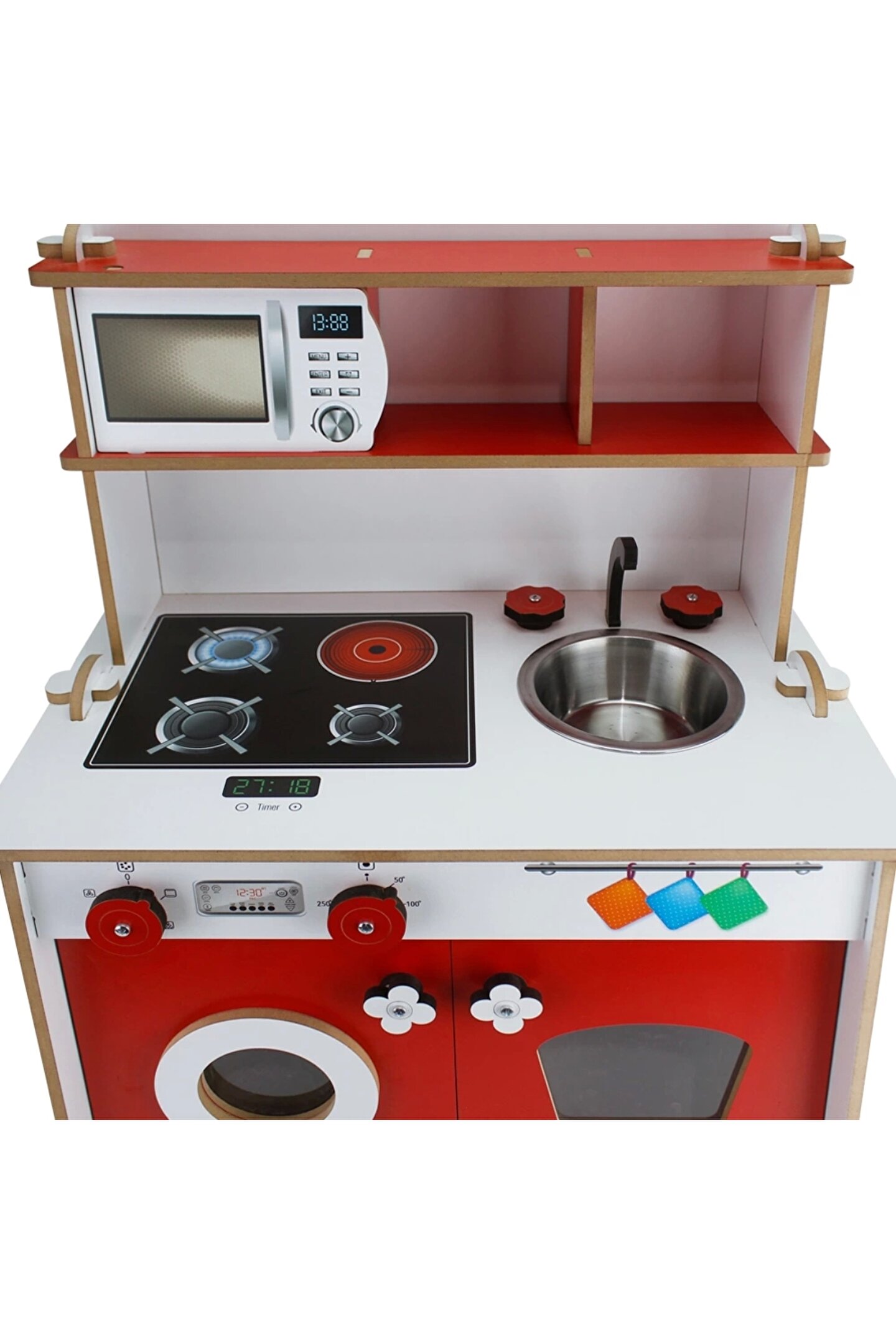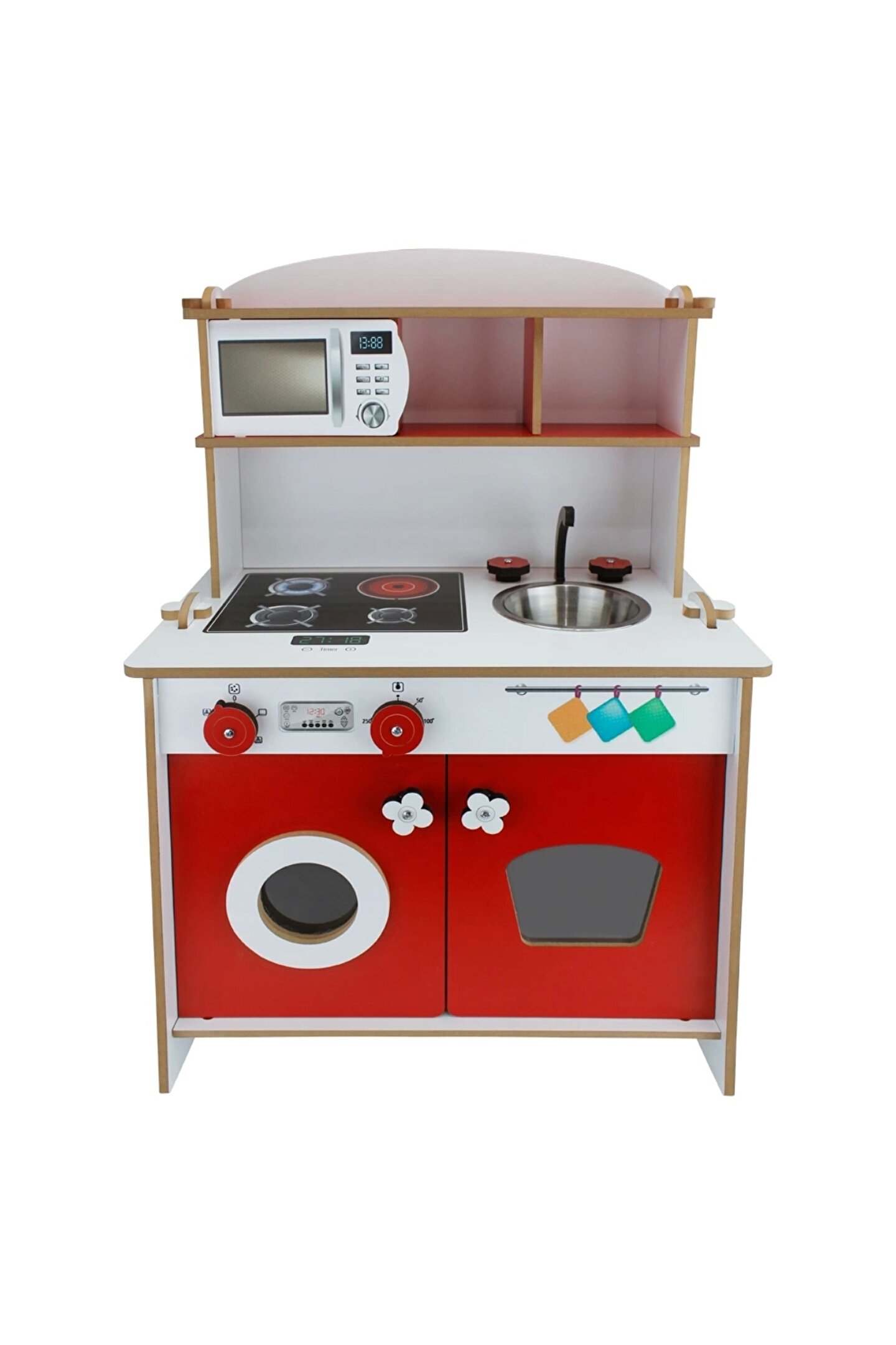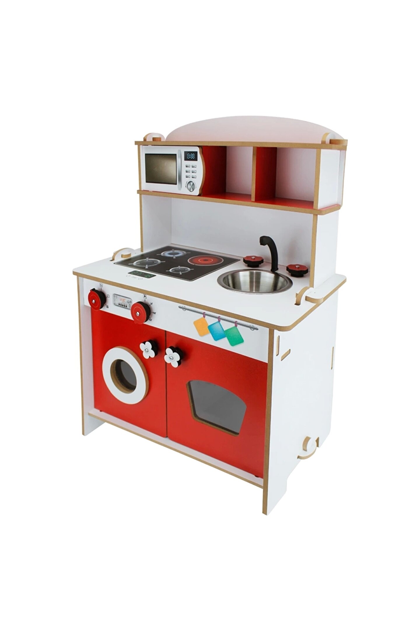 Pratik Hamarat Ahşap Mutfak - Ahşap Çocuk Mutfağı - Mutfak Seti - Kapaklı Mutfak - Kırmızı