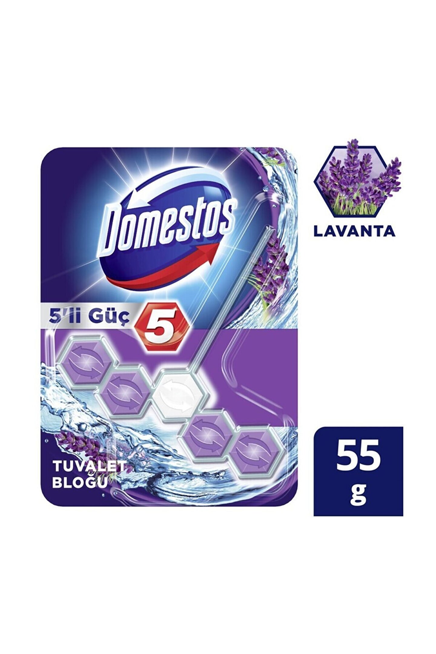 Domestos 5’li Güç Tuvalet Bloğu Lavanta, her sifonda hijyen, tazelik ve ferah bir koku sağlar.; 5 güçlü temizlik faydası ile donatılmış olan tuvalet bloğu, ferahlık hissi veren lavanta notası ile tuvalet kokusu yenilemenin yanında tuvaletteki kir ve lekeleri önleyerek maksimum parlaklık ve hijyen sunar.; Klozet içine yerleştirilerek pratik kullanım sunan Domestos 5’li Güç Tuvalet Bloğu, tuvalet temizliğinde yeni bir deneyim sunar.; Domestos Tuvalet Blokları bileşeninde yer alan güçlü temizleyici köpük, her sifon çekişinde aktif hâle gelerek güç ve zahmet gerektirmeden etkili tuvalet temizliği yapmanızı sağlar.; Kireç önleyici formülü sayesinde kireç kalıntılarının oluşmasını engeller.; Tuvalet yüzeyinde uzun süreli parlaklık sağlayan temizleyici bloklar, sahip olduğu güçlü lavanta kokusu ile kalıcı bir tazelik ve ferahlık hissi sunar.; Domestos 5’li Güç Tuvalet Bloğu, etkili klozet temizliği performansı sunarak ulaşılması güç klozet kenarları ve iç yüzeyin tek bir sifonla zahmetsiz şekilde temizlenmesine imkân sunar.; Her yıkamada devreye giren temizlik gücü formülü, kir, leke ve kireçlere karşı savaşarak uzun süreli tuvalet hijyeni sağlar.;