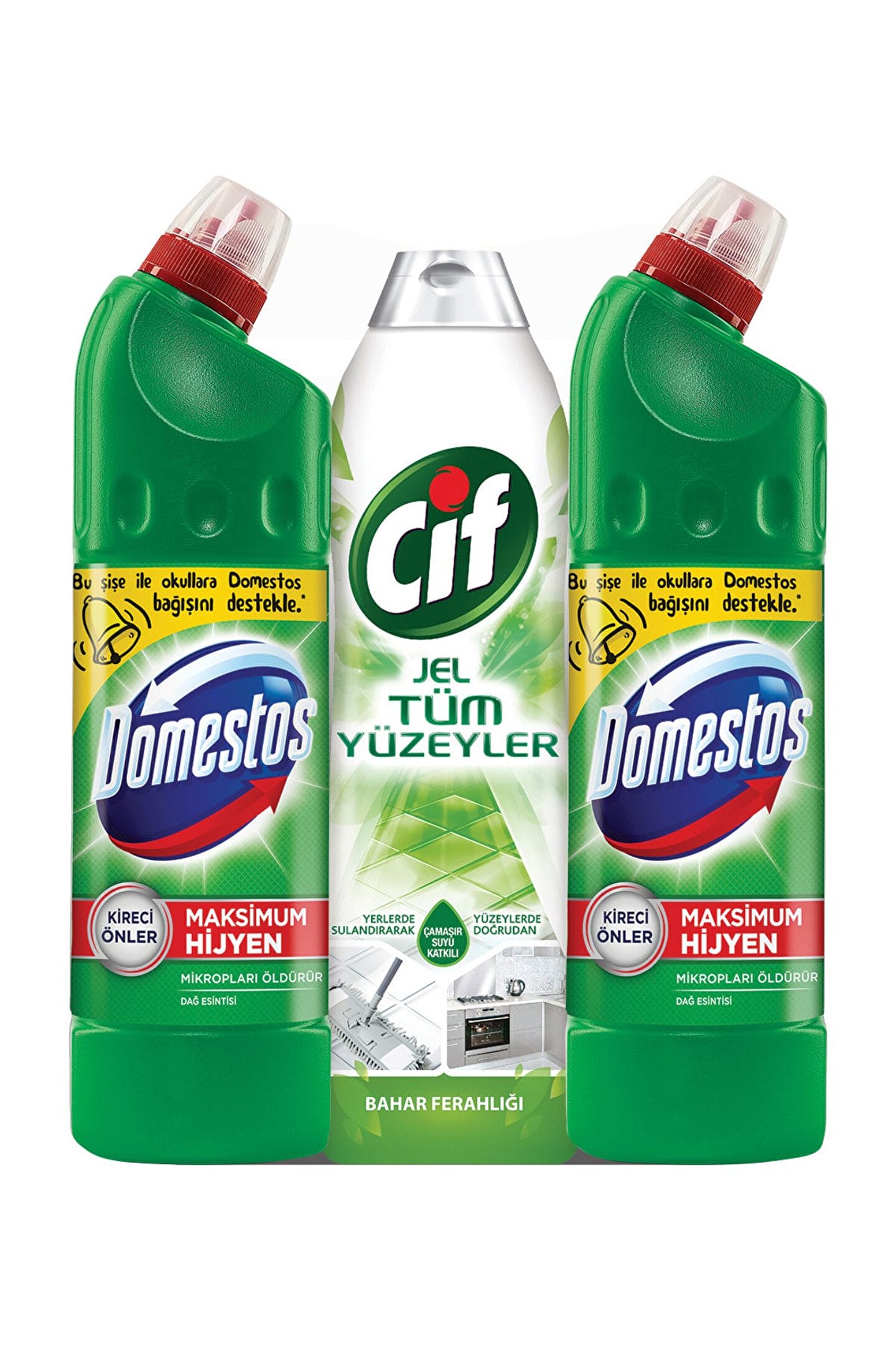 Paket İçeriği;Dağ Esintisi Ve Kar Beyazı 810 g 2 Adet;Cif Tüm Yüzeyler İçin Jel Bahar Ferahlığı 750 ml;Ultra yoğun kıvamıyla ekstra beyazlık verir. Mikroplara karşı bile %100 hijyen sağlar. Her yönden koruma için tuvalet ve banyo gibi yerlerde kullanabilirsiniz;Çamaşır suyunun tenle ve gözle temas etmemesi gerekir. Bu tip bir durumla karşılaşılır ise bol suyla durulanmalıdır.;Cif Jel Banyo Temizleyicisi evde temizliği neredeyse en zor olan yeri, banyolarınızı pratik bir şekilde temizlemenizi sağlar. Cif Banyo Jeli özellikle kireç oluşumuna karşı etkilidir. Banyonuzu pırıl pırıl yapar. Gün boyu geçmeyen taze ve ferah bir koku yayar;Diş macunu ve diş fırçalarını sakladığınız kabın hijyeni çok önemlidir. Çamaşır suyunda iyice mikropların kırılması için bekletilmeli sonra da bol suyla durulanmalıdır.
