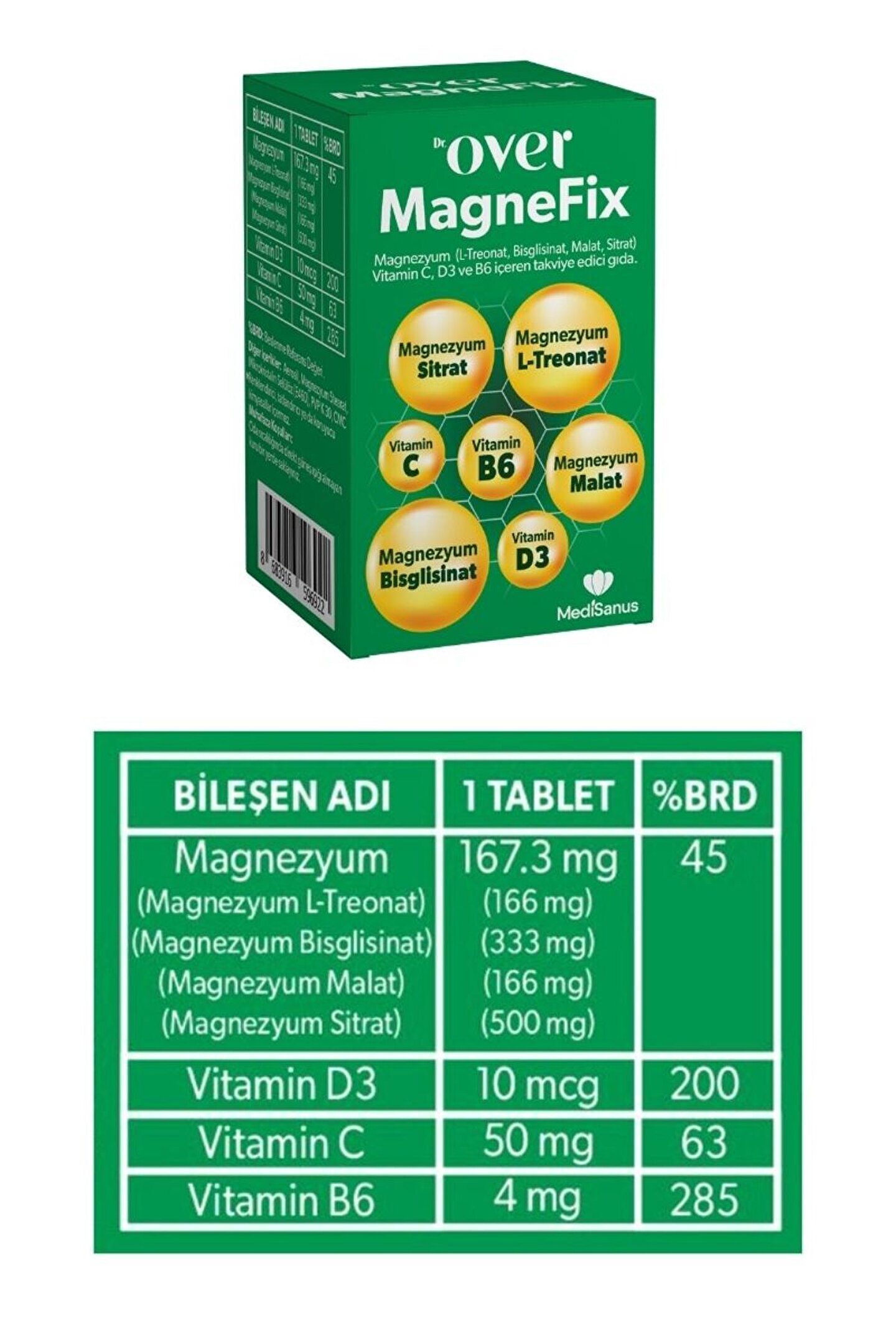 Dr. Over Magnefix i simli Magnezyum içeren gıda takviyesinin içeriğinde Magnezyum L-Treonat, Magnezyum Bisglisinat, Magnezyum Malat, Magnezyum Sitrat, D3 Vitamini, C Vitamini ve B6 Vitamini bulunmaktadır.
