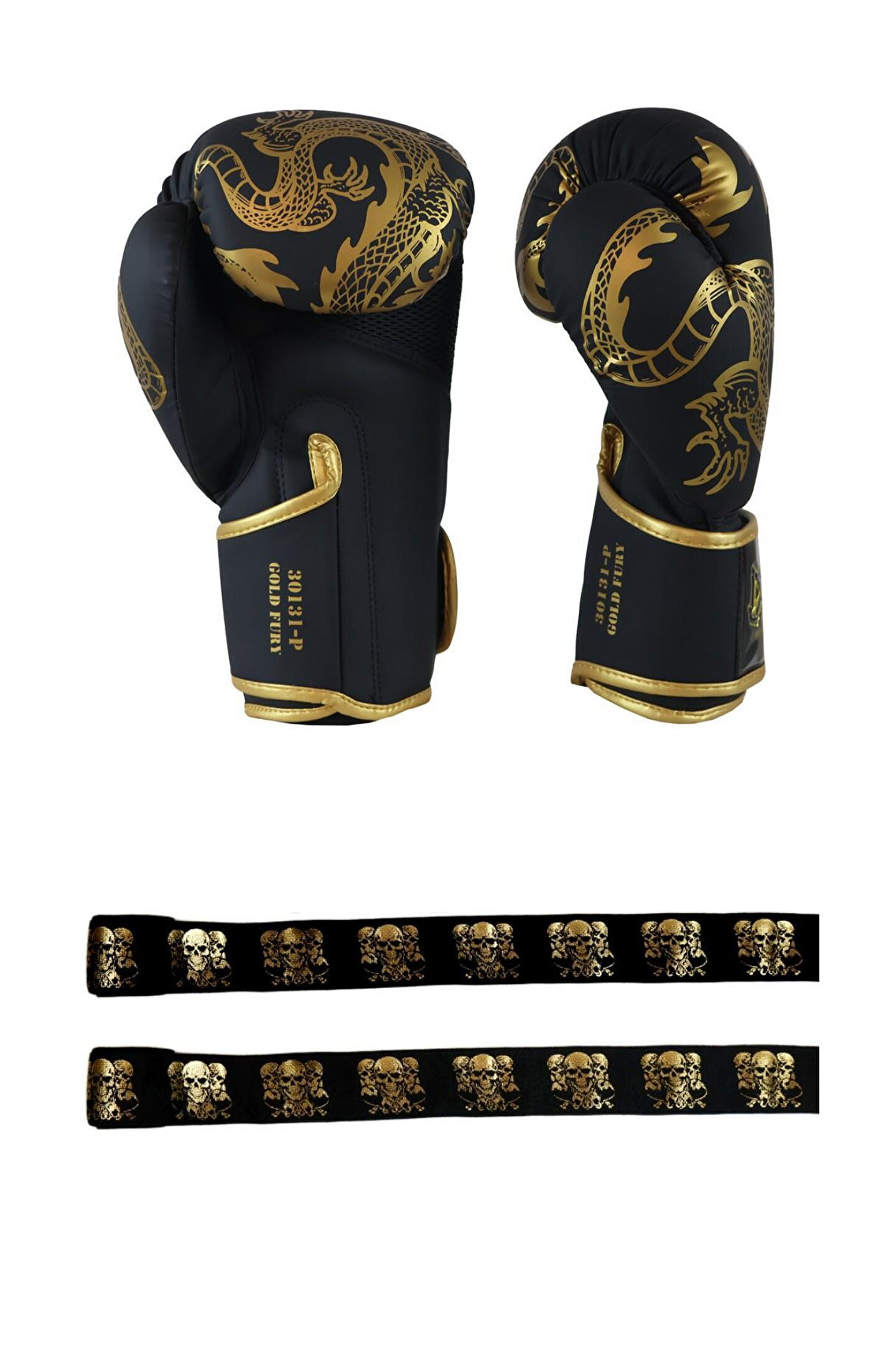 Dragondo Gold Fury Boks Eldiveni Muay Thai Eldiveni ve Skull Gold 3,5 Mt Kuru Kafalı Boks Bandajı