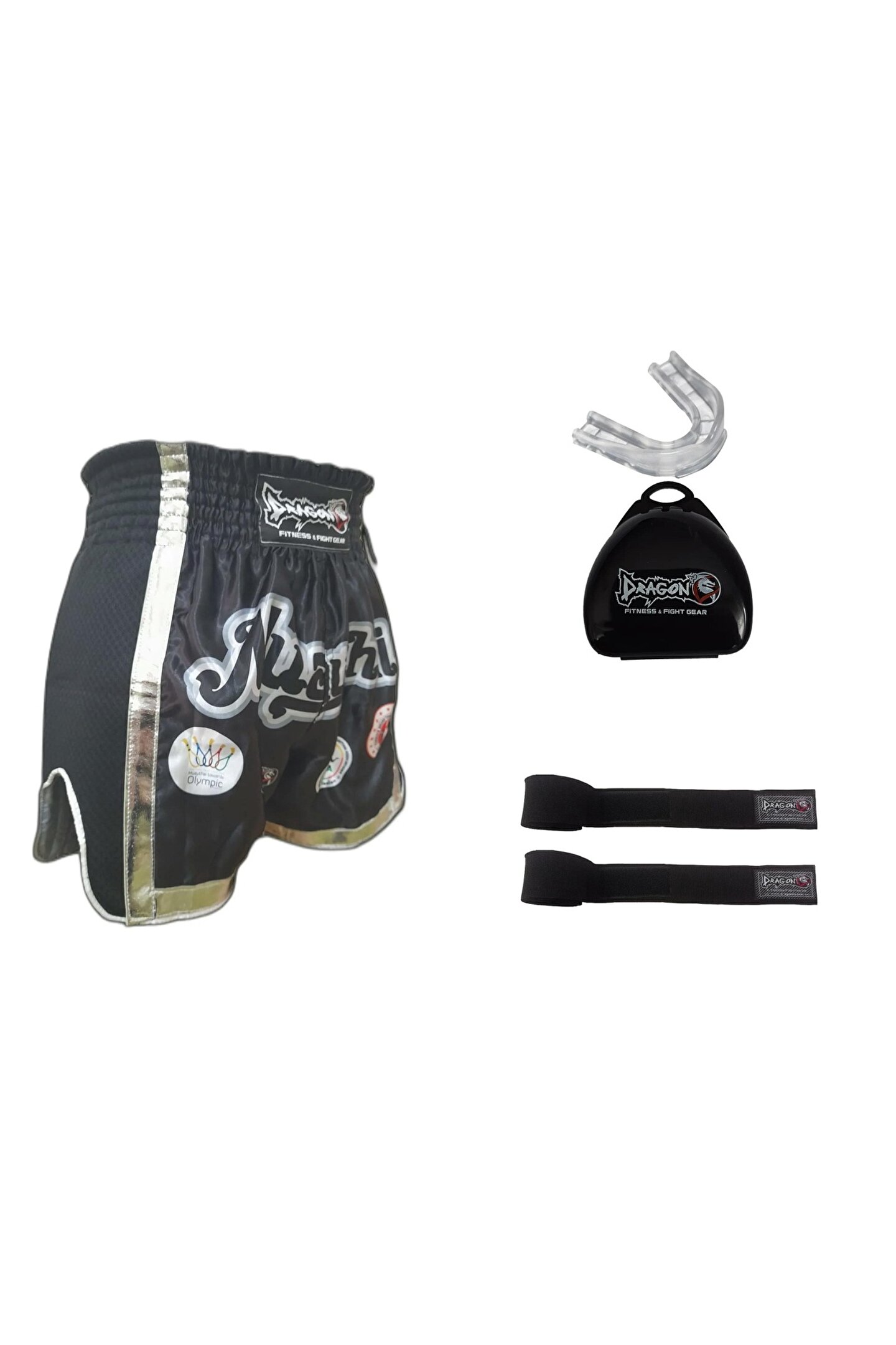 Dragondo sporcu Mt2019 Onaylı Muay Thai Müsabaka Şort gri şeritli, Profesyonel kutulu Dişlik ve 3.5mt bandaj