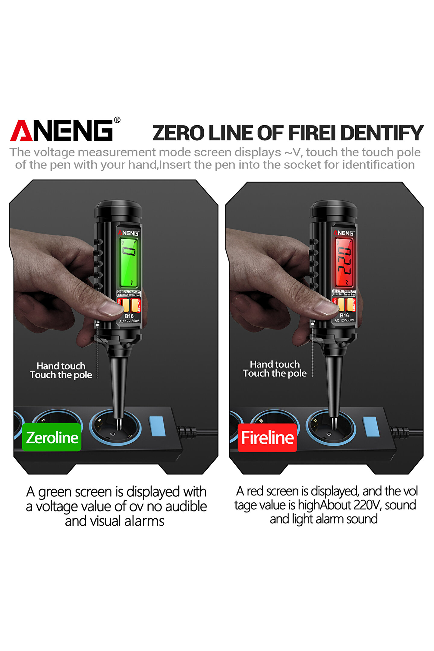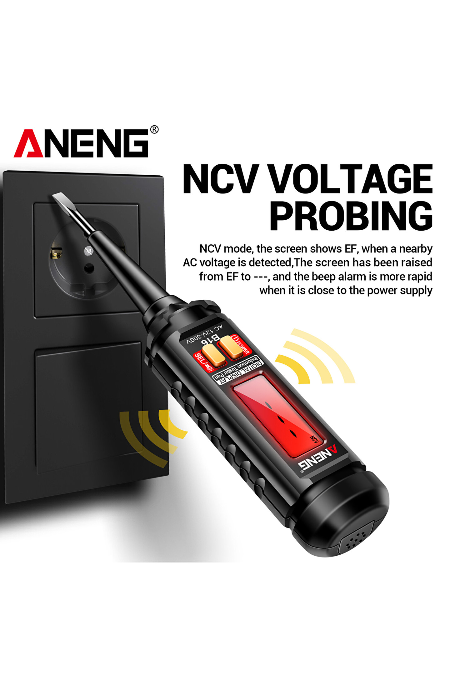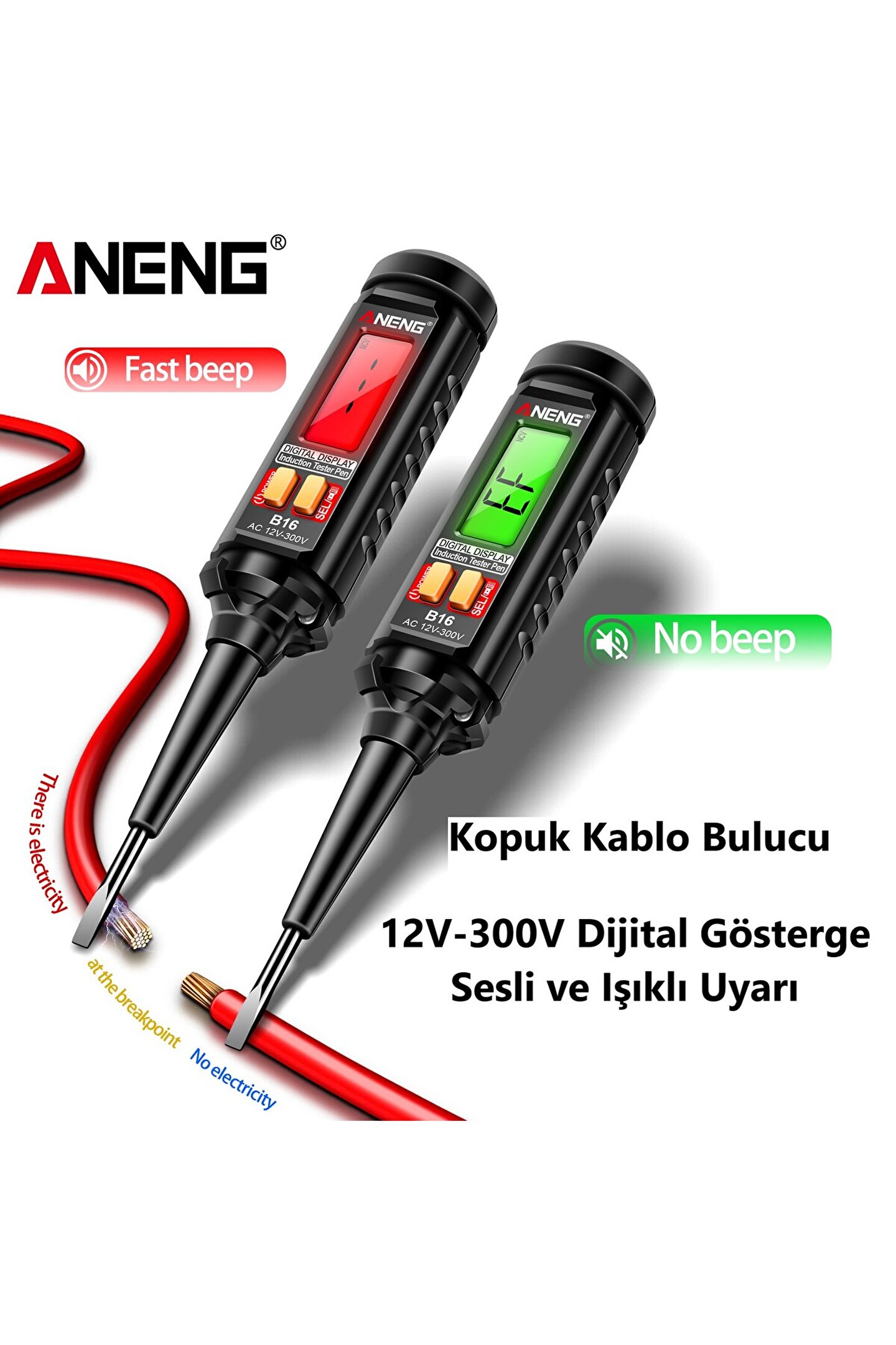 ANENG B16 Temassız Gerilim Detektörü - LCD Ekranlı Kontrol Kalemi - 12V-300V Sesli ve Işıklı Uyarı (Faz/Nötr ve Kablo Kopukluk Bulucu)