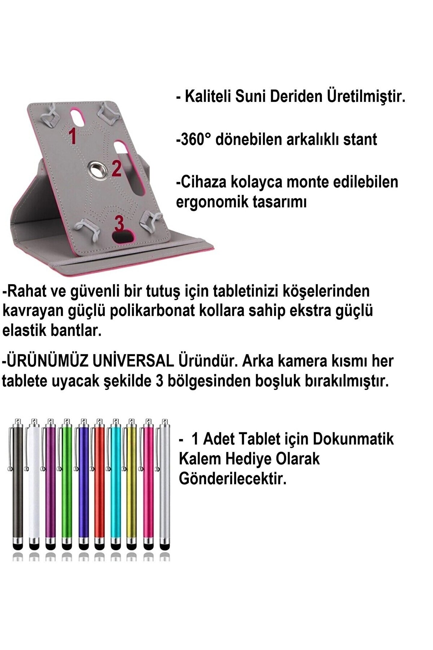Tablet Kılıfı Üstün özellikli. ; -Ürün oldukça şık tasarıma sahip olup tabletinizi dış etkenlerden korur... ; - Kullanımı rahat Ergonomik ve zarif tasarımıyla tabletinizi tamamlayacak ve renk katacak bir aksesuardır. ; -Cihaza kolayca monte edilebilen ergonomik tasarımı sayesinde ürün kullanımında herhangi bir zorluk yaşamadan tabletinizin tüm işlevlerini rahatlıkla kullanabilirsiniz. ; -Kılıf tabletinizin lcd ekranını koruyacağı gibi kirden tozdan muhafaza edilmesine yardımcı olur. ; -Ergonomik şık kalıp kesimi ve esnekliği sayesinde tabletinize kusursuz bir biçimde uyacaktır. ; -Kolaylıkla takılıp çıkarılabilecek son derece şık bir kapaktır sade ve eşsiz tasarımı sayesinde tabletiniz artık güvende ve daha şık. ; -Ürünümüz Kaliteli Suni Deridir Kesinlikle Kalitesiz Çin Ürünlerinden değildir. ; -Kullanımı Kolay Ergonomiktir. ; Dönebilen yapısı ile yan ve dik olarak stand olarak kullanabilirsiniz. ; Tablet kullanımında önemli olan cihazınızı stand konumunda sağlam olarak kullanabilmektir.Bu üründe bu mümkündür. ; Kademeli stand özelliği ile istenilen düzeyde yataylık sağlanabilir. ; Cihaz kılıf içerisindeki kısma oturtularak kullanılır.Farklı renk seçenekleri ile sizlerle Artık diğer kılıflara dünyanın servetini ödemeyi gerek bıraktırmayan kılıflarımızı gönül rahatlığı ile kullanabilirsiniz. ; NOT: ÜRÜNÜMÜZ UNİVERSAL Üründür. ; Arka kamera kısmı her tablete uyacak şekilde 3 BÖLGESİNDEN boşluk bırakılmıştır. ; NOT: HEDİYE OLARAK GÖNDERMİŞ OLDUĞUMUZ DOKUNMATİK KALEM RENGİ VE MODELİ STOK DURUMUNA GÖRE DEĞİŞEBİLİR;