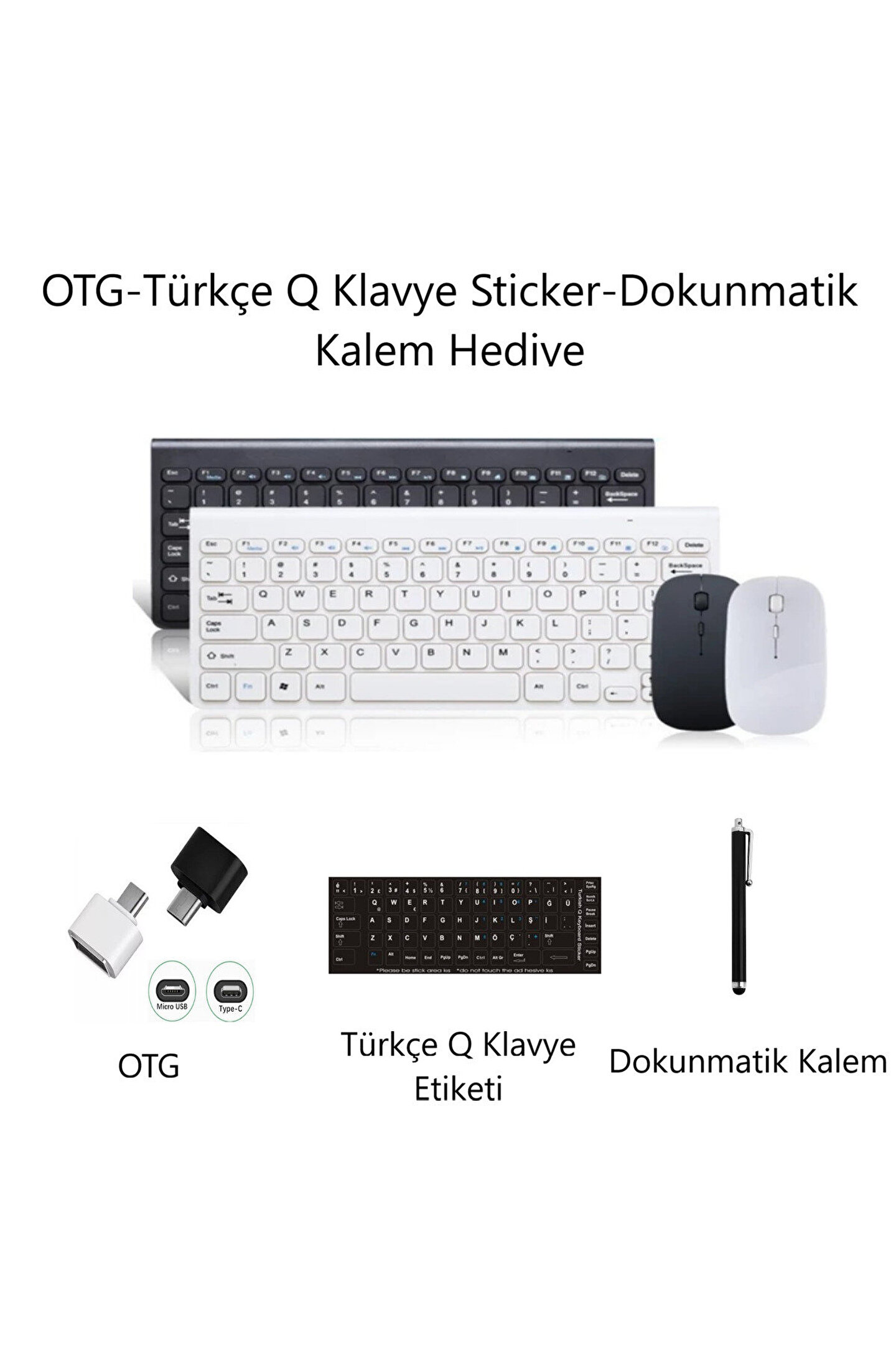 Mini Slim 2.4 GHz Kablosuz Q Klavye Mouse Set Klavye Tüm marka ve model bilgisayar, dizüstü bilgisayar ve tabletler ile uyumludur. ; Ultra ince slim tasarım ile dayanıklı malzemeden yapılmıştır, sessiz tuşlar rahat bir kullanım sağlar. ; Mouse simetrisi ve ergonomisi tasarımı ile elleriniz için mükemmel uyum sağlar. ; Uzaktan kablosuz 10 metreye kadar rahatça kullanabilirsiniz. ; Akıllı güç tasarrufu ile kullanılmadığı zaman otomatik uyku moduna geçer. ; Ek bir yazılım yüklemeden hem klavye hem de fare için bir tane USB alıcı ile bağlantı sağlanır. ; Ayarlanabilir DPI ile mouse 3 hassasiyet seviyesi (800/1200/1600) Pil modeli 4 Adet AAA pil (pakete dahil değildir) Malzeme : ABS Plastik Klavye boyutu: 284/134/18mm Mouse boyutu: 59/113/20mm Paket İçeriği 1 * Kablosuz Slim Klavye 1 * Kablosuz Slim Mouse 1 * USB Alıcı 1*OTG Adaptör;