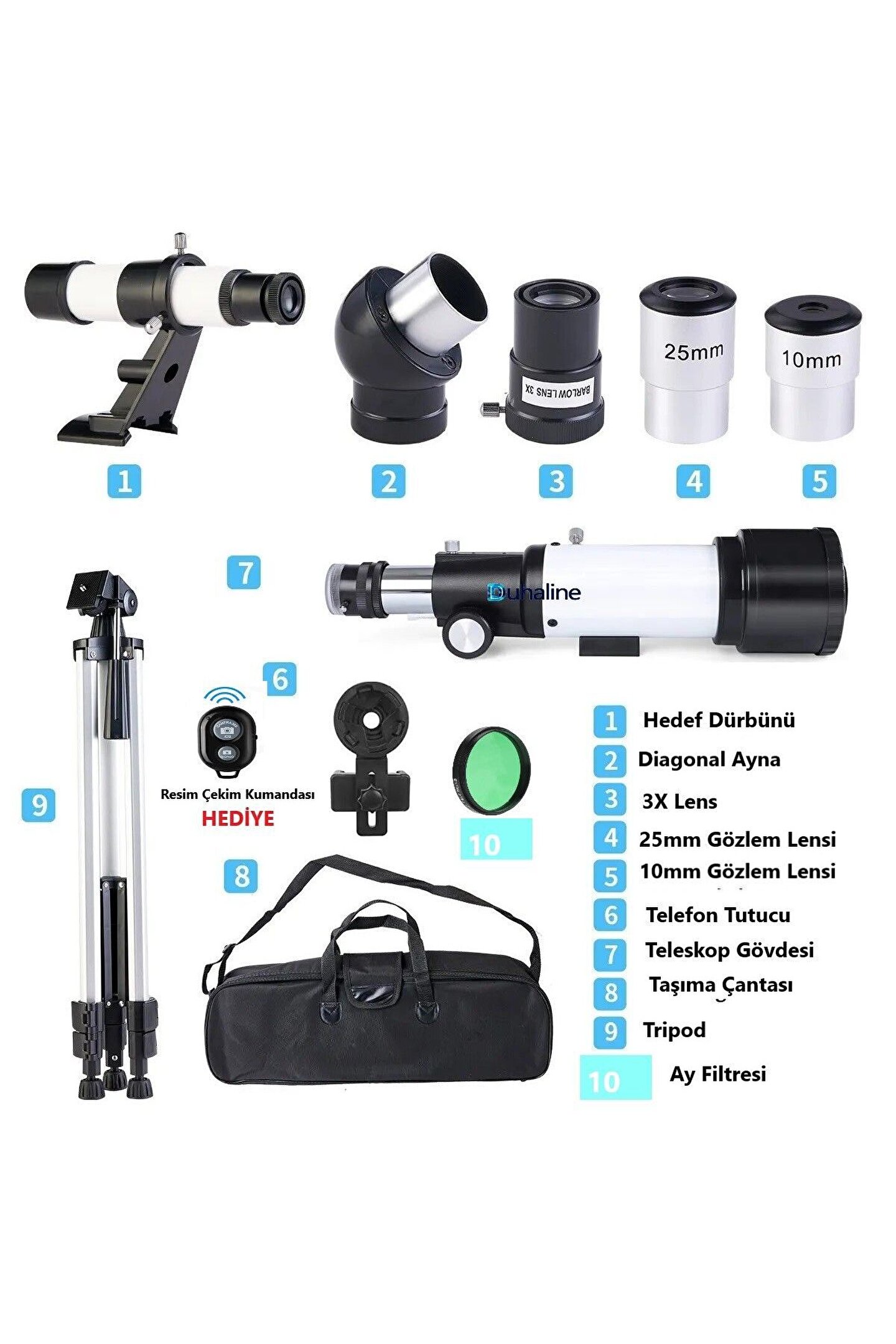 FULLSET!!! En komple aksesuarlar. Bir teleskop, tripod, ay filtresi, bir ceptelefonu tutucu adaptörü, bir Zenit ayna, bir uzaktan kumanda, bir hedef bulucuskop, 3 kat barlo objektif, 2 mercek (10mm ve 25mm) ve bir taşıma çantası ilegönderielcektir..