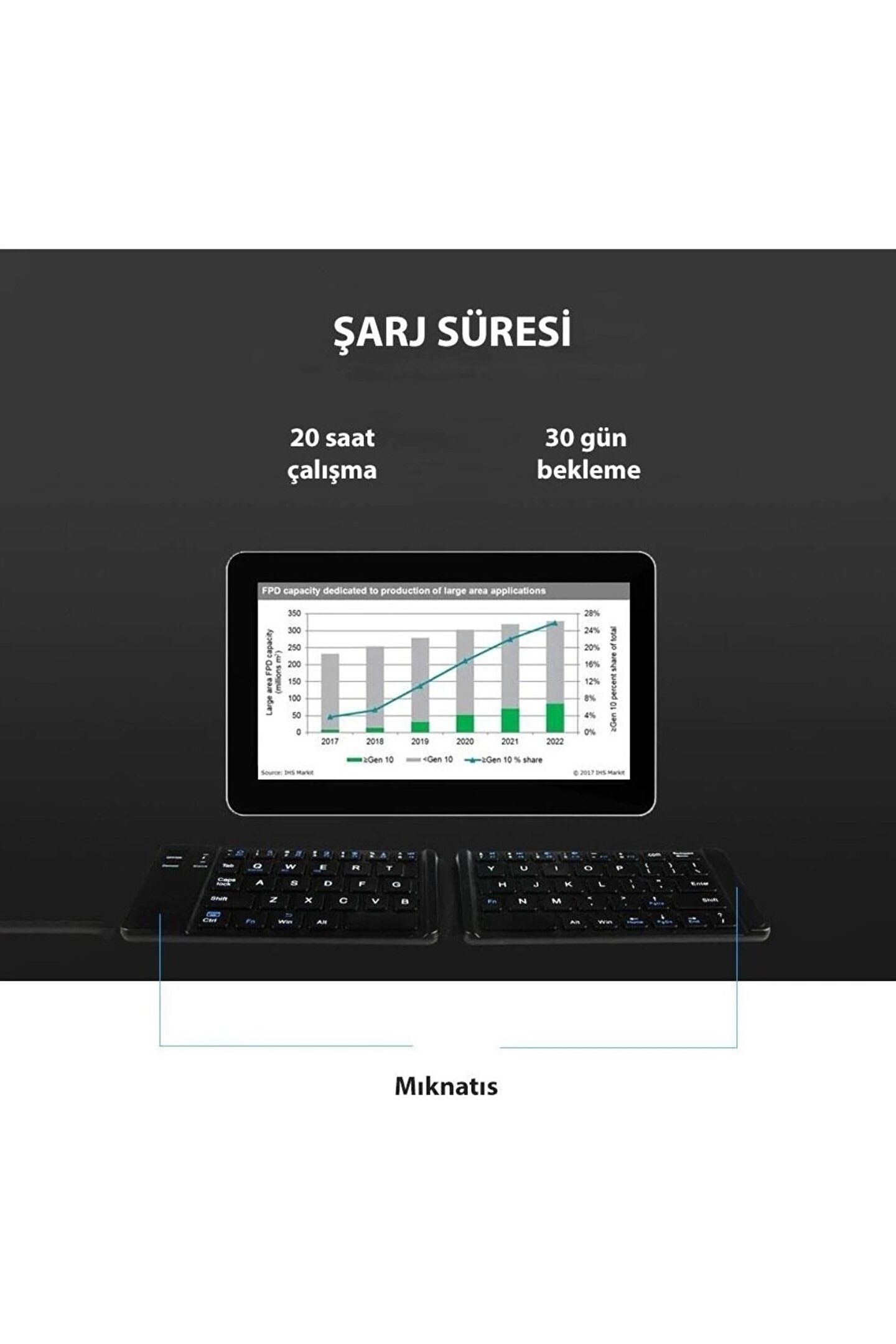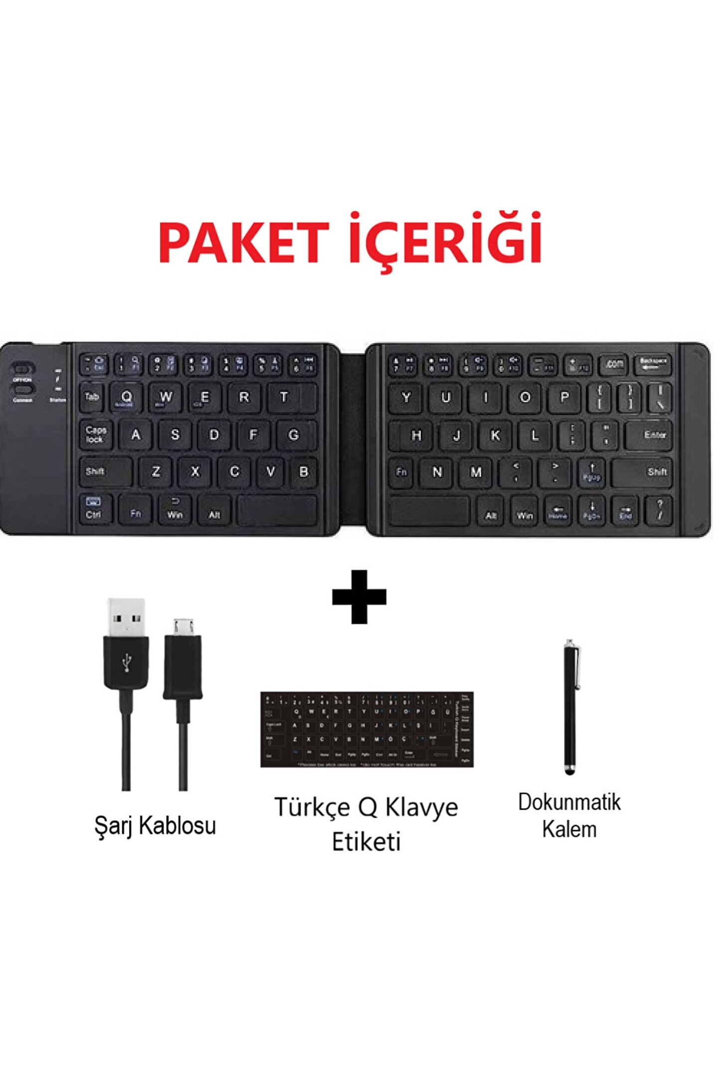 Bluetooth kablosuz katlanabilir klavye telefon tablet pc uyumlu Ürün tanıtımı: Paket içeriği: 1*bluetooth klavye 1*dokunmatik kalem 1*türkçe klavye etiketi Bluetooth 3.0, etkili aralık: 10 metre 33. ; Batarya: 90mah şarj edilebilir lityum batarya 4. ; Iki katlı ultra ince tasarım, konforlu ve şık, taşıması kolay Makas anahtarı tasarımı: Makas-Anahtar tasarımı, yazmayı kolaylaştırır ve gürültü yoktur, size sessiz kullanım deneyimi sağlar. ; Uzun çalışma süresi: Klavye 20 saat süren çalışma ve 30 gün bekleme destekleyebilir Katlanabilir ve kompakt: Hafif ve mini klavyeyi istediğiniz yere taşıyabilirsiniz. ; Seyahat için çok uygundur. ; . ; Evrensel: Klavye çoğu tablet, bilgisayar ve telefon için uyumludur. ; Özellikleri *malzeme : Abs *anahtar numarası : 67 adet *voltaj : 3-4.2v *bağlantı yöntemi : Bluetooth bağlantısı *ara yüz tipi : Usb 3.0 *pil kapasitesi : 120 mah lityum pil *bluetooth protokolü : 3.0 *etkili mesafe : >10 metre *düğme ömrü süreleri : 3 milyon tıklama *sistem desteği : Ios, android, windows *genişletilmiş boyut : 313*85*7.5mm;