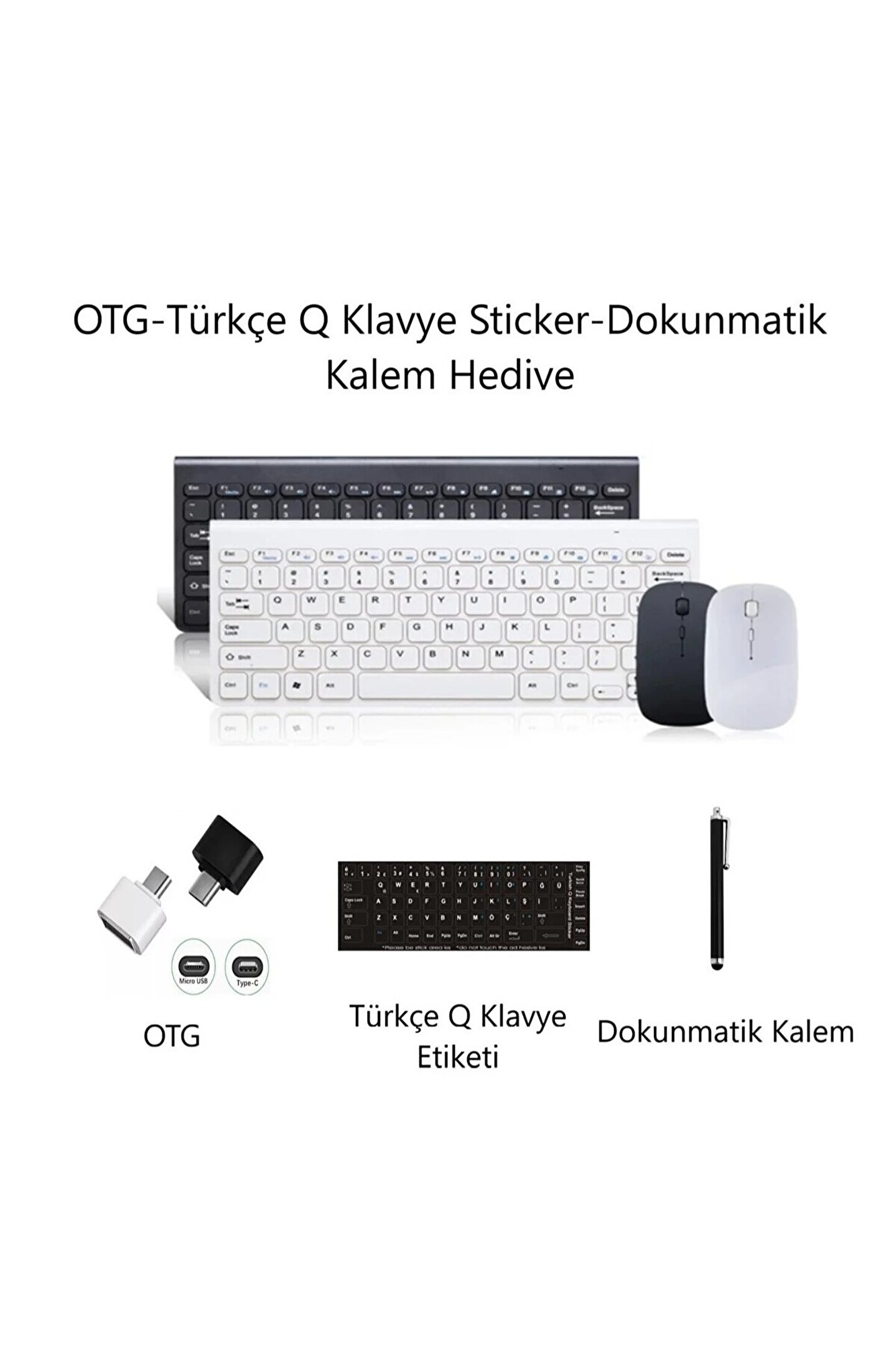 Samsung Galaxy Tab S9 Ultra Tablet Uyumlu Kablosuz Taşınabilir Q Klavye Ve Mouse Set BEYAZ Mini 2.4 GHz Kablosuz Q Klavye Mouse Set Klavye Tüm marka ve model bilgisayar, dizüstü bilgisayar ve tabletler ile uyumludur. ; Ultra ince slim tasarım ile dayanıklı malzemeden yapılmıştır, sessiz tuşlar rahat bir kullanım sağlar. ; Mouse simetrisi ve ergonomisi tasarımı ile elleriniz için mükemmel uyum sağlar. ; Uzaktan kablosuz 10 metreye kadar rahatça kullanabilirsiniz. ; Akıllı güç tasarrufu ile kullanılmadığı zaman otomatik uyku moduna geçer. ; Ek bir yazılım yüklemeden hem klavye hem de fare için bir tane USB alıcı ile bağlantı sağlanır. ; Ayarlanabilir DPI ile mouse 3 hassasiyet seviyesi (800/1200/1600) Pil modeli 4 Adet AAA pil (pakete dahil değildir) Malzeme : ABS Plastik Klavye boyutu: 284/134/18mm Mouse boyutu: 59/113/20mm Paket İçeriği 1 * Kablosuz Klavye 1 * Kablosuz Mouse 1 * USB Alıcı 1*OTG Adaptör;