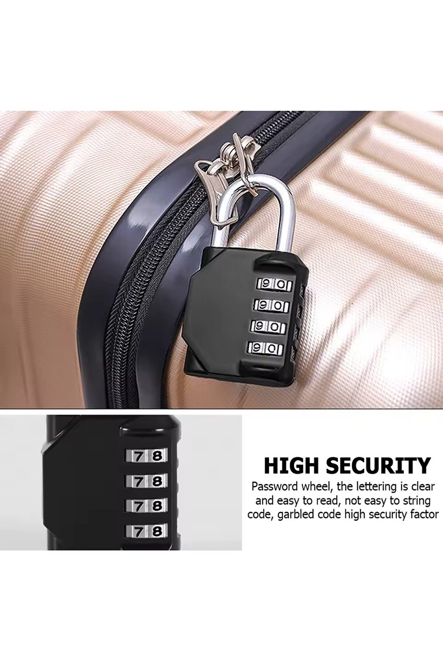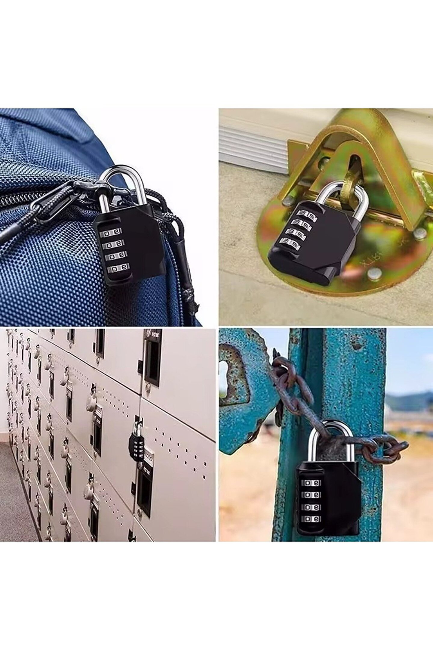 4 haneli şifreli asma kilit, dayanıklı çinko alaşım gövdesi ve karbon çelik kancasıyla eşyalarınızı korur. Dolap, valiz, bisiklet, spor salonu ve seyahat çantalarında güvenli kullanım sağlar.