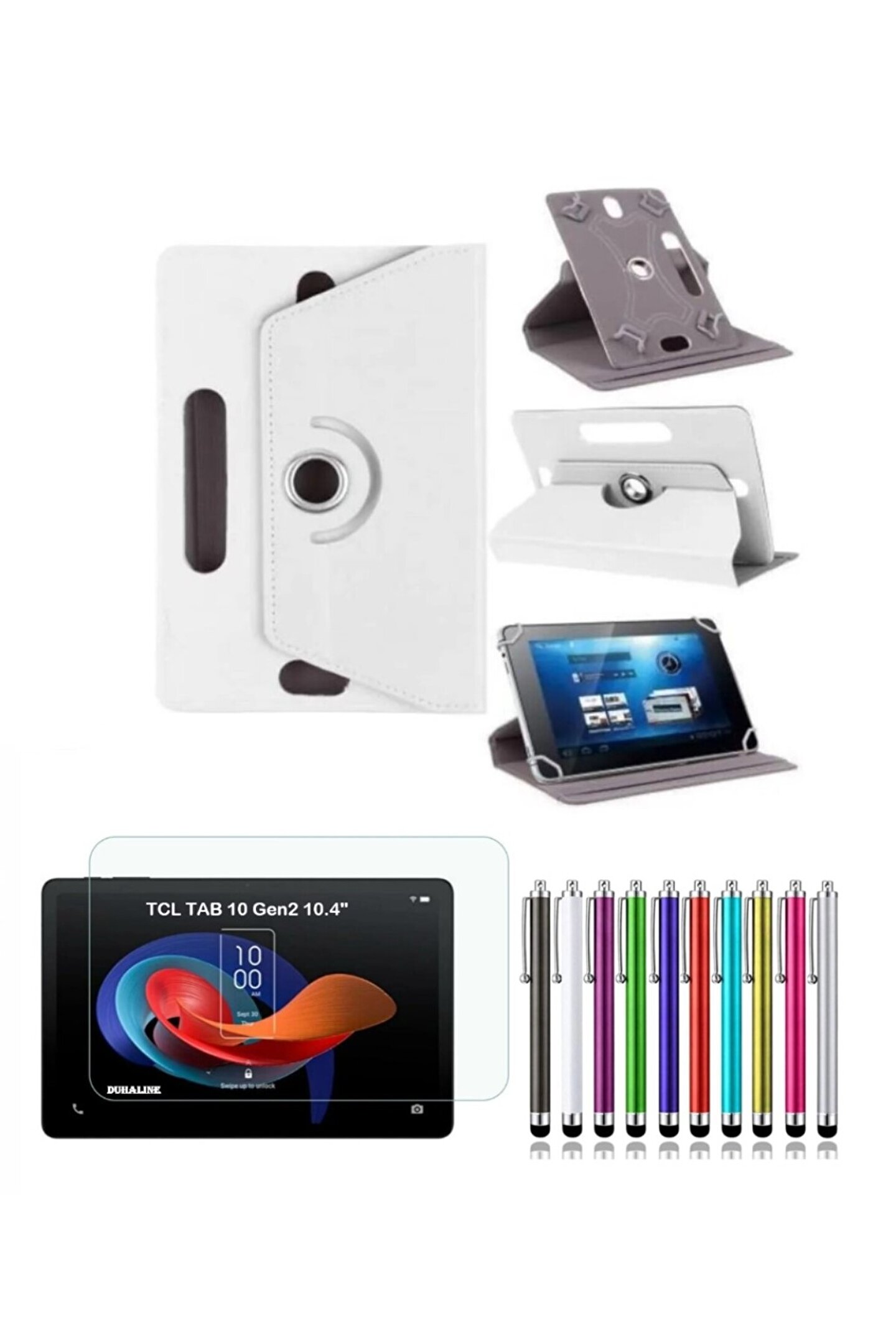 TCL Tab 10 Gen2 modeliyle tam uyumlu, cihazınızın ekranını darbelere ve çizilmelere karşı koruyan kapaklı kılıf tasarımı; Ekranınızı çizilmelere ve darbelere karşı koruyan dayanıklı malzeme ile uzun süreli kullanım imkanı sunar; Standlı tablet kılıfı sayesinde, tabletinizi rahatça kullanabilir ve istediğiniz açıda konumlandırabilirsiniz; Kırılmaz ekran koruyucu ile tablet ekranınızın çizilmelere ve darbelere karşı ekstra koruma altında kalmasını sağlar; Dokunmatik kalem dahil olmak üzere, tablet deneyiminizi daha da zenginleştiren ekstra aksesuarlar;
