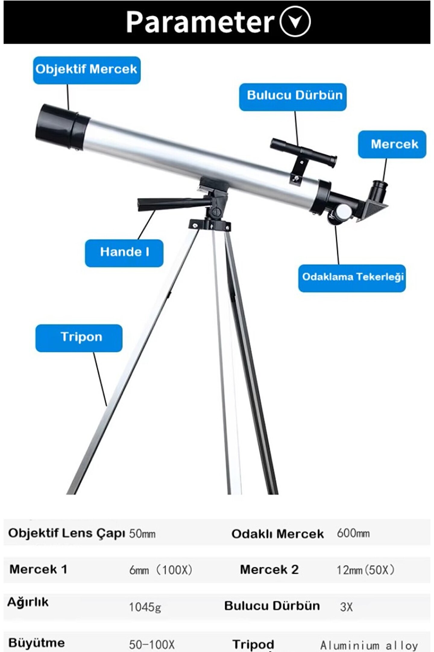 • GALAKSİSİNİ GÖZLEMLEMEK İÇİN İHTİYACINIZ OLAN HER ŞEY: Tam set, 50X ve 100X lensli teleskop, 2 lens kutusu, 1 3X vizör dürbünü, 1 ayarlanabilir tripod ve 1 teleskop lens kapağını içerir!
