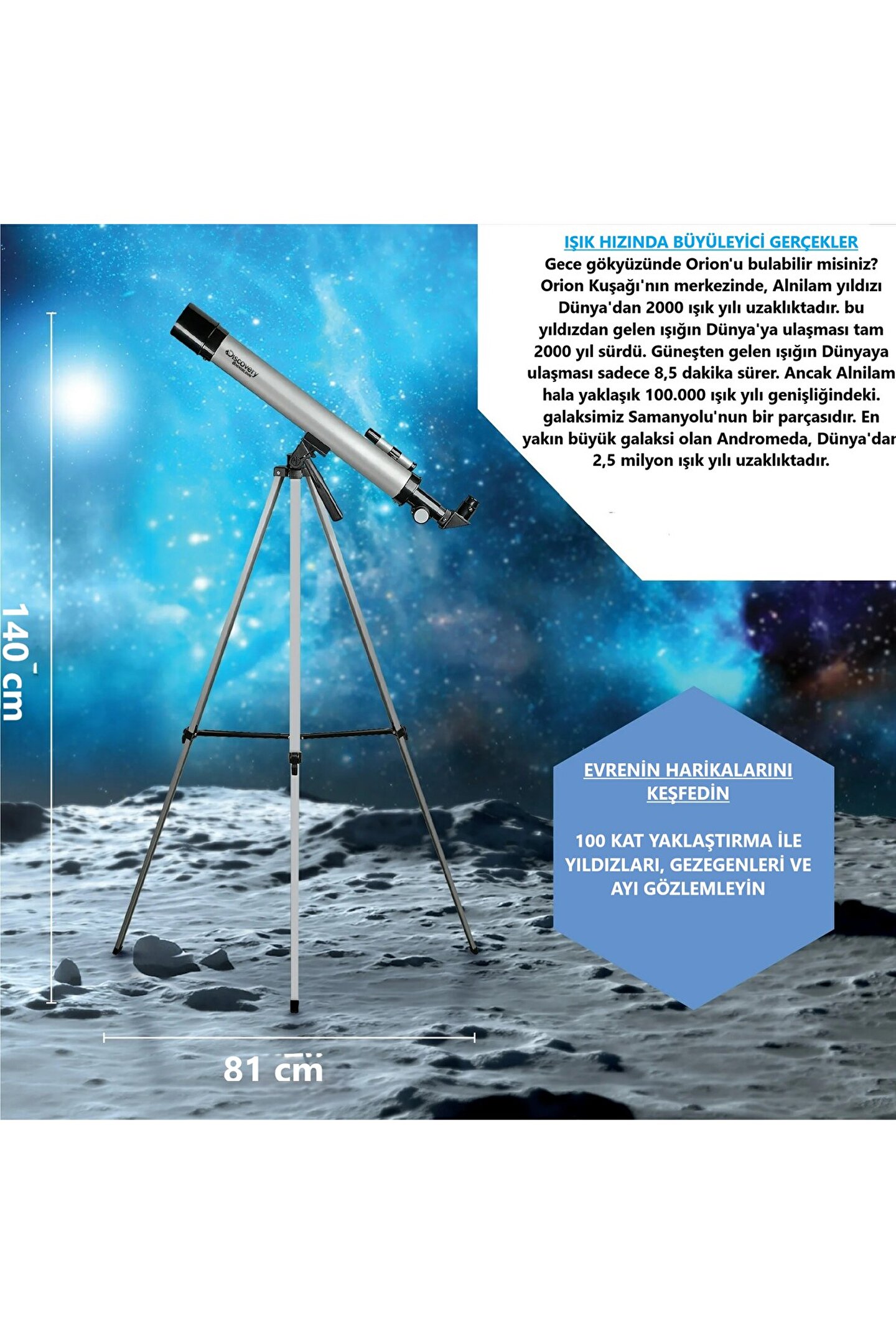 Kozmosun harikalarını keşfedin 50X/100x Teleskobu, gecegökyüzünü daha önce hiç olmadığı gibi gözlemlemenizi sağlar! Bu profesyonelteleskop, uzaydaki nesneleri çıplak gözle olduğundan 100 kata kadar daha yakıngörünecek şekilde görüntülemenizi kolaylaştırır! Yıldızları, gezegenleri vehatta uyduların kraterlerini keşfedin! 3X, 50X, 100X Kapasitesi Bu teleskop,çıplak gözle görülemeyen uzaydaki nesneleri görmenizi sağlayan iki güçlü 50X ve100X merceğe sahiptir. Ayrıca, daha büyük merceklerle yakınlaştırma yapmadanönce nesneleri daha kolay bulmanızı sağlayan bir 3X bulucu dürbünü de ekledik.Pan ve Tilt Tripod, mükemmel görünümü elde etmek için gereken tüm özellikleresahiptir. Tripod bacakları ayarlanabilir ve her boyuttaki kullanıcınınteleskopu rahatça kullanabilmesi için genişleyebilir ve yoğunlaşabilir. Pan vetilt işlevleri, mükemmel görüntüleme açısı sağlar. Özellikler: 50X ve 100Xlensler 3X bulucu dürbünü Pan ve tilt özellikli ayarlanabilir tripod Çocuklarve yetişkinler için boyutlandırılmıştır