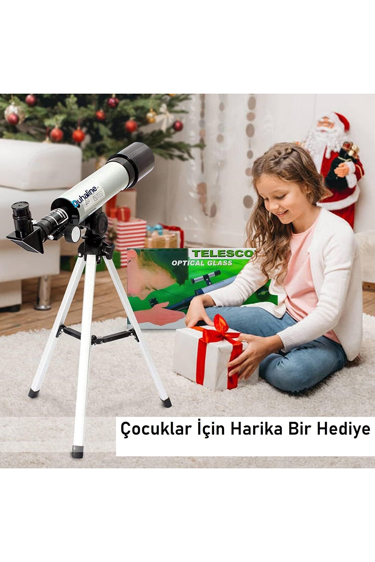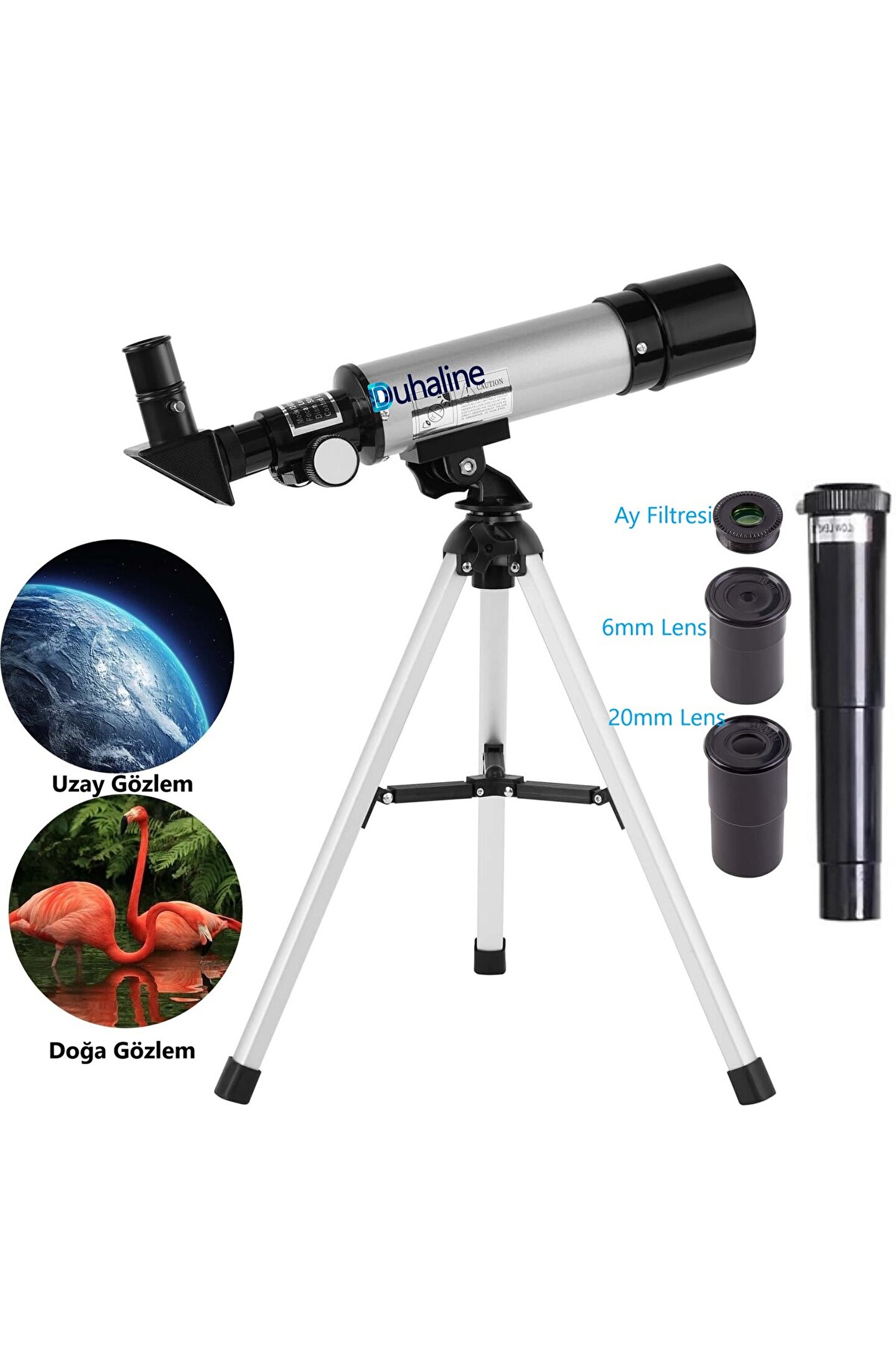 DUAHLİNE 90X Model DUHALİNE tripodlu teleskopumuzun kullanımı oldukça uygundur.; Ayrıca bu astronomik teleskop çocuklar veya yeni başlayanlar için son derece uygundur.; Büyütme hakkında 1,5X Dik Mercek ile iki göz merceği ile donatılmıştır Yüksek Büyütme: 18X, 27X, 60X, 90X 20mm Mercek = 18X Büyütme 6mm Mercek = 60X Büyütme 20mm Mercek + 1,5X Dik Mercek = 27X Büyütme 6mm Mercek + 1,5X Dik Mercek = 90X Büyütme Ayarlanabilir tripod Teleskop için sabit bir platform sağlayan ölçeklenebilir alüminyum tripod.; Bu sağlam tripod sayesinde, derin gökyüzünü keşfederken manuel ağır çekim göksel izlemenin keyfini çıkarabilirsiniz.; Braketi hareket ettirmeden dikey yön 180 derece, yatay yön ise 360 derece ayarlanabilir.; Kolay Montaj 1. Teleskop tüpünü tripod platformuna yerleştirin, ardından tüpü tripoda sıkıca tutmak için tripod kafasındaki Montaj Kilit Düğmesini sıkın.; 2. H6mm, H20mm göz merceklerini çapraz aynaya yerleştirin.; Göz merceğini güvenli bir şekilde yerinde tutmak için küçük krom ayar vidasını saat yönünde çevirerek sıkın.; 3. Ay aynası mercek içine vidalanmıştır Bu Teleskop Bilim Kiti ile Ayı ve Meteoru Keşfedin Özellikler: Malzeme: ABS akrilik Odak Uzaklığı: 360 mm Açıklık: 50 mm Mercek: H6mm, H20mm, 1,5X Dik Mercek Yüksek Büyütme: 18X, 27X, 60X, 90X Çapraz prizmalar: 90° açılı prizma Özellikler Ürün boyutu: uzunluk 15,4''/39cm; genişlik 3''/7,5cm; yükseklik 3,3''/8,5cm Paket boyutu: uzunluk 17,5''/44,5cm; genişlik 8,3''/21cm; yükseklik 3,9''/10cm Tripod yüksekliği (maksimum): 13,4''/34cm Teorik çözünürlük: 2,000 yay saniyesi Net ağırlık: 32,9oz/933g