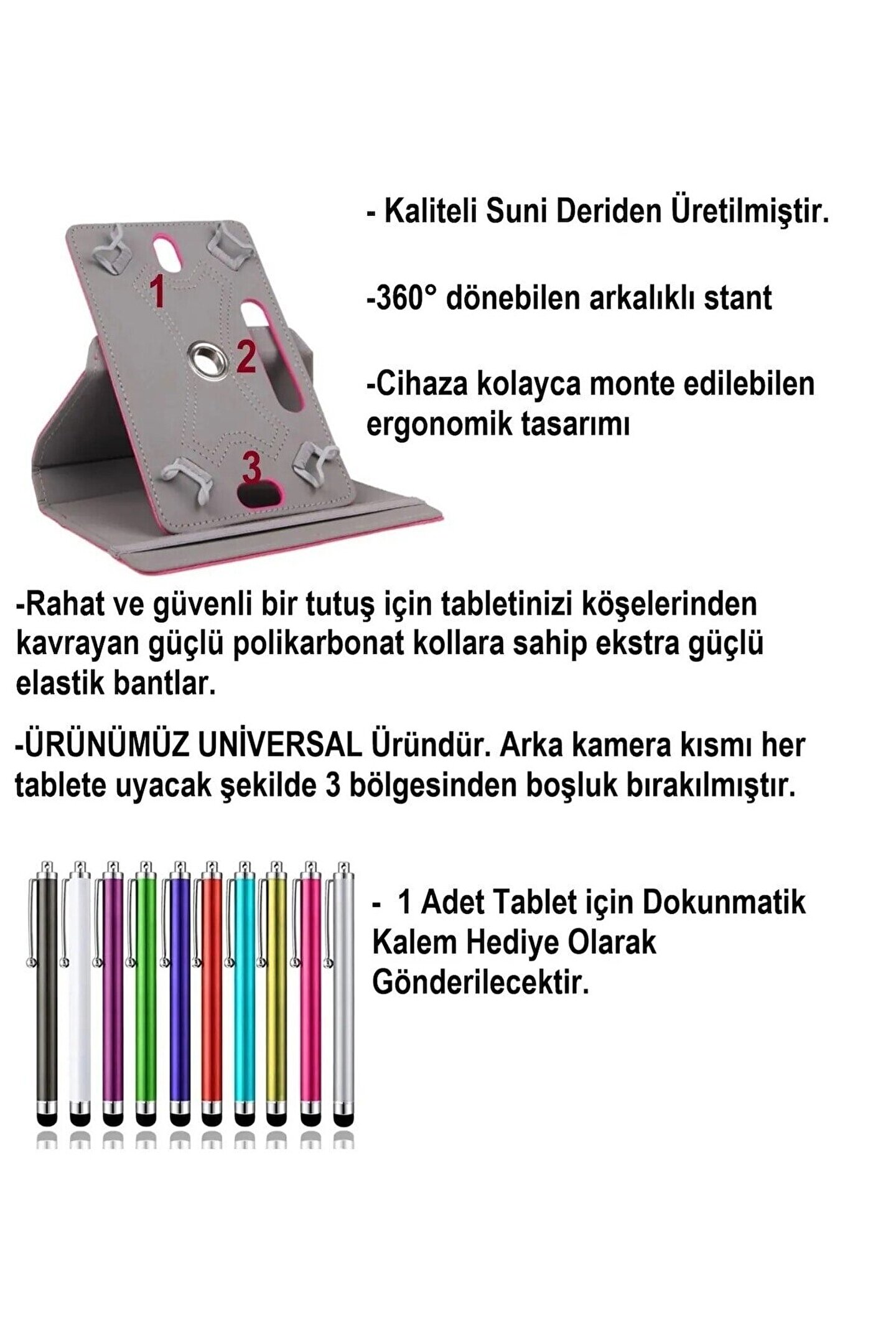 DÖNER STANTLI TABLET KILIFI + NANO KIRILMAZ EKRAN KORUYUCU CAM + DOKUNMATİK KALEM NANO KIRILMAZ EKRAN KORUYUCU CAM ÖZELİKLERİ Ekran koruyucu ilan başlığındaki model ile tam uyumludur. ; Lütfe tablet modelinizden emin olunuz. ; Farklı tablet modelerine uyum sağlamayacaktır. ; • Kırılmaz, Çizilmez, Leke Tutmaz, Yansıma Yapmaz, HD Clear Şeffaf • Nano Teknoloji Ürünü, Tüm Özellikler bir arada, • Devrim Niteliğinde Ultra Güçlü Ekran Koruyucu! • Temperli Kırılmaz Camlara göre Daha İnce ve Daha Sağlamdır. ; • Ekranda film fark edilmez, Dokunmatik ekranı doğal görünümünü korur • Anti-Glare kir tutmaz. ; Parmaz İzi bırakmaz, Işığı yansıtmazdır. ; • HD Clear Şeffaf, Dokunmatik ekranında film yokmuş gibi ekranı kullanabilirsiniz. ; • Yüksek kalite ultra ince şeffaf film materyalden üretilmiştir. ; • Ekranını kir ve darbeden korur, çizilmesini önler Kolayca takıp çıkartılabilir, • Hiçbir etki bırakmaz. ; • Harika kalıp kesimi sayesinde ekrana mükemmel uyar • Uzun ömürlüdür, darbelere karşı maximum korur. ; Tablet Kılıfı Üstün özellikli. ; -Ürün oldukça şık tasarıma sahip olup tabletinizi dış etkenlerden korur... ; - Kullanımı rahat Ergonomik ve zarif tasarımıyla tabletinizi tamamlayacak ve renk katacak bir aksesuardır. ; -Cihaza kolayca monte edilebilen ergonomik tasarımı sayesinde ürün kullanımında herhangi bir zorluk yaşamadan tabletinizin tüm işlevlerini rahatlıkla kullanabilirsiniz. ; -Kılıf tabletinizin darbelerden koruyacağı gibi kirden tozdan muhafaza edilmesine yardımcı olur. ; -Ergonomik şık kalıp kesimi ve esnekliği sayesinde tabletinize kusursuz bir biçimde uyacaktır. ; -Kolaylıkla takılıp çıkarılabilecek son derece şık bir kapaktır sade ve eşsiz tasarımı sayesinde tabletiniz artık güvende ve daha şık. ; -Ürünümüz Kaliteli Suni Deridir Kesinlikle Kalitesiz Çin Ürünlerinden değildir. ; -Kullanımı Kolay Ergonomiktir. ; Dönebilen yapısı ile yan ve dik olarak stand olarak kullanabilirsiniz. ; Tablet kullanımında önemli olan cihazınızı stand konumunda sağlam olarak kullanabilmektir.Bu üründe bu mümkündür. ; Kademeli stand özelliği ile istenilen düzeyde yataylık sağlanabilir. ; Cihaz kılıf içerisindeki kısma oturtularak kullanılır. ; Farklı renk seçenekleri ile sizlerle Artık diğer kılıflara dünyanın servetini ödemeyi gerek bıraktırmayan kılıflarımızı gönül rahatlığı ile kullanabilirsiniz. ; NOT: ÜRÜNÜMÜZ UNİVERSAL Üründür. ; Arka kamera kısmı her tablete uyacak şekilde 3 BÖLGESİNDEN boşluk bırakılmıştır. ; Bazı tabletler kamera boşlukları denk gelmeyebilir. ; NOT: HEDİYE OLARA GÖNDERMİŞ OLDUĞUMUZ DOKUNMATİK KALEM RENGİ VE MODELİ STOK DURUMUNA GÖRE DEĞİŞEBİİLİR;