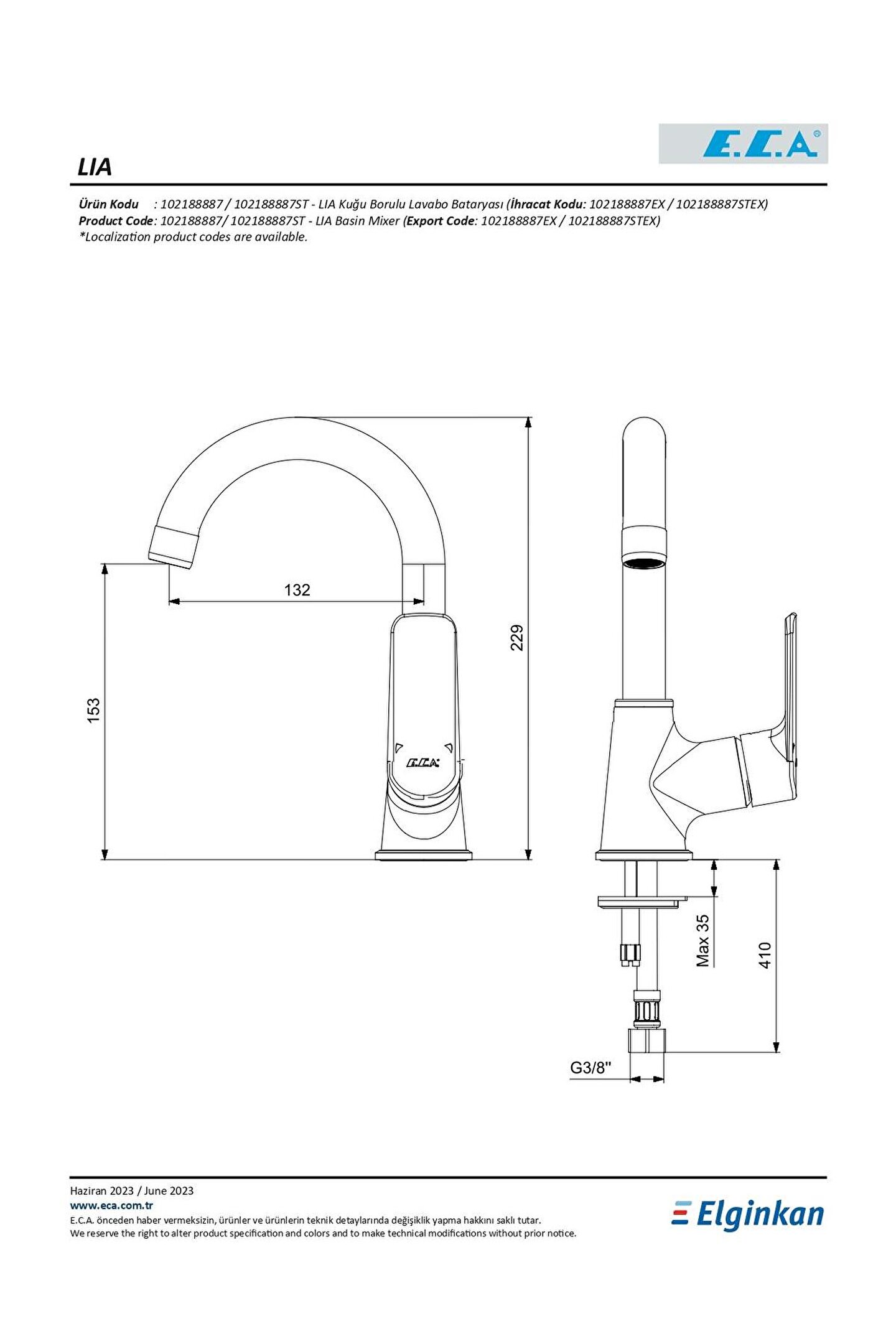 Eca Lia Eviye Bataryası Kuğu Borulu •Çıkış ucu uzunluğu 192 mm’dir • Çıkış ucu yüksekliği 223 mm’dir • Kireç kırıcılı perlatöre sahiptir • 3 bar basınçta su akış miktarı dakikada maksimum 6,3 lt