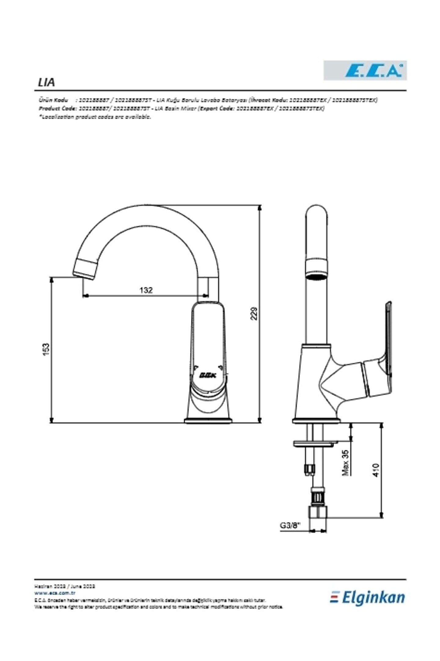 Eca Lia Eviye Bataryası Kuğu Borulu •Çıkış ucu uzunluğu 192 mm’dir • Çıkış ucu yüksekliği 223 mm’dir • Kireç kırıcılı perlatöre sahiptir • 3 bar basınçta su akış miktarı dakikada maksimum 6,3 lt