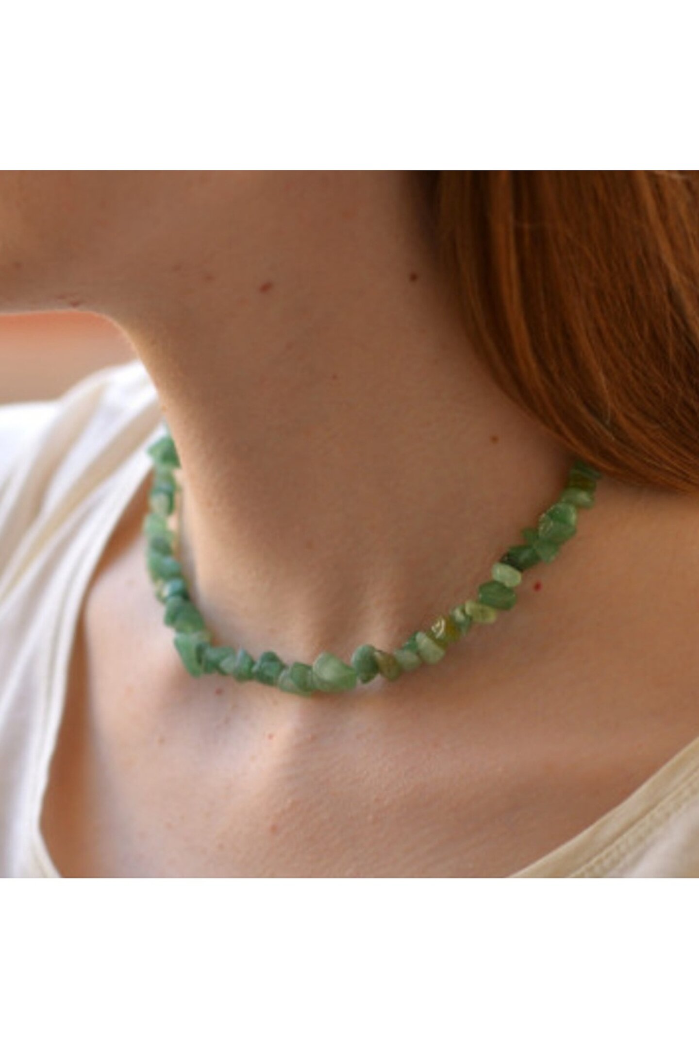 Doğal Aventurin taşı kullanılarak üretilmiş, şıklığı ve zarafeti bir arada sunan kolye; 7 mm boyutundaki taşlar, her türlü kıyafetle kolayca uyum sağlayarak günlük kullanım için idealdir; Aventurin taşı, benzersiz renk tonları ve desenleriyle göz alıcı bir görünüm kazandırır; Doğal taş materyali sayesinde her kolye benzersizdir ve her zaman özgün bir stil ifade eder;