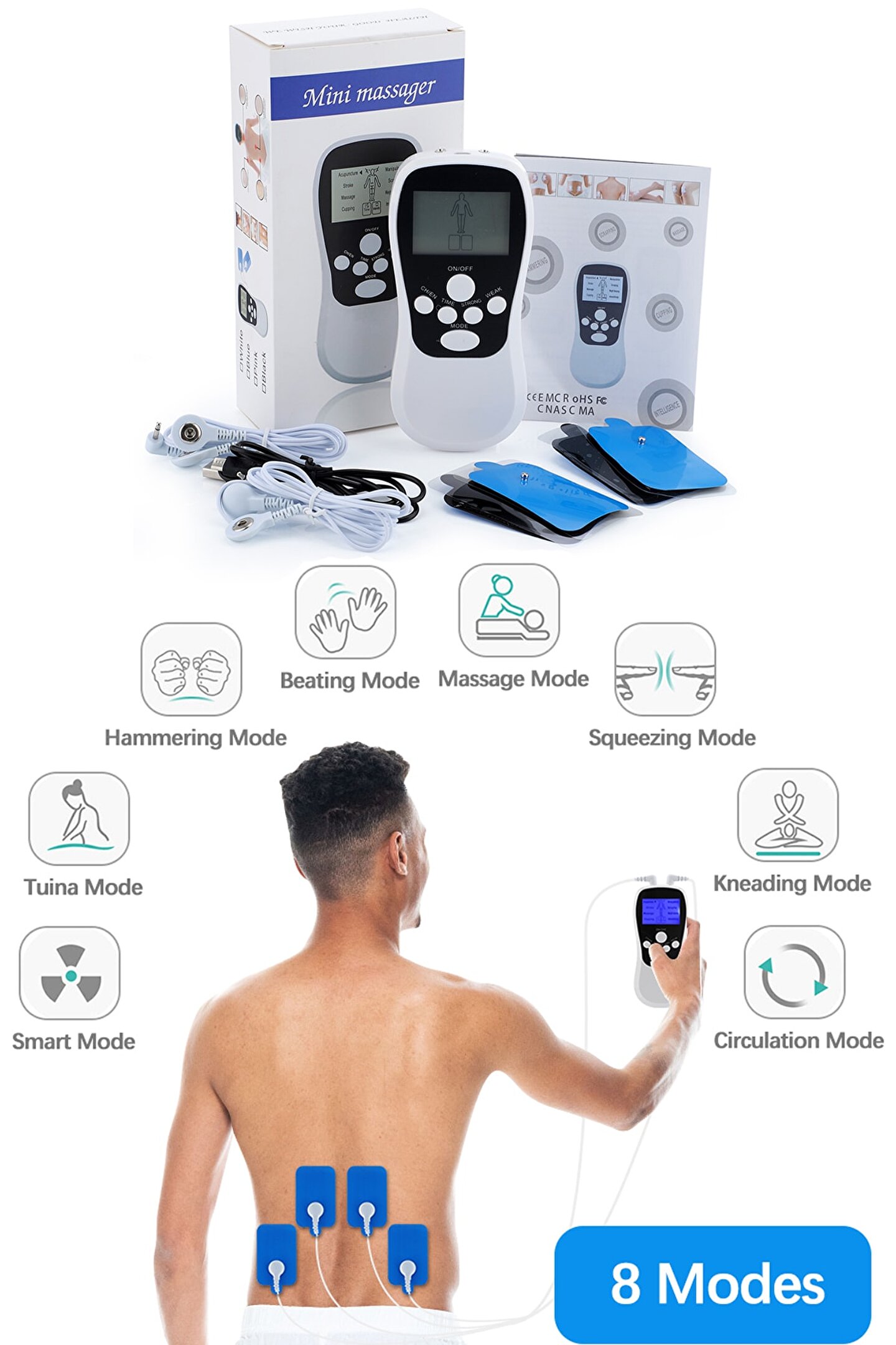 Uluslararası gelişmiş mikro bilgisayar elektronik teknolojisi kullanılarak yüksek teknoloji içeriğine sahip bu tür çok işlevli mikro elektronik masaj aleti olarak üretilmiştir. Geliştirilen bu cihaz düşük devirli simülasyon altında insan vücuduna masaj uygulaması yapmaktadır. Günün yorgunluğunu almanızda ve vücudunuzun rahatlamasında size yardımcı olacaktır. ; Cihaz omuz, bel, diz, eller ve ayaklar için uygundur. ; Kullanımı kolay, kendi kendine uygulaması kolaydır. ; 8 farklı mod özelliği vardır. ; Pil ve USB kablo ile çalıştırılabilme özelliği mevcuttur. ;