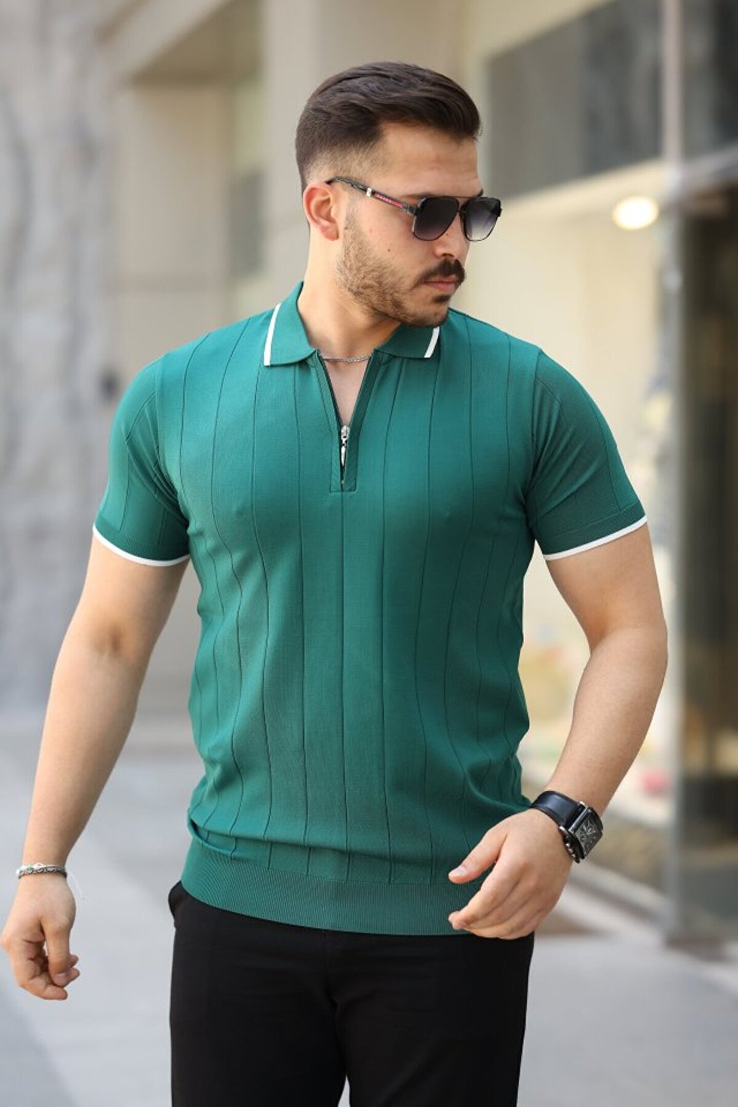 Erkek Fermuar Yakalı çizgi Dokulu Kısa Kollu Tişört