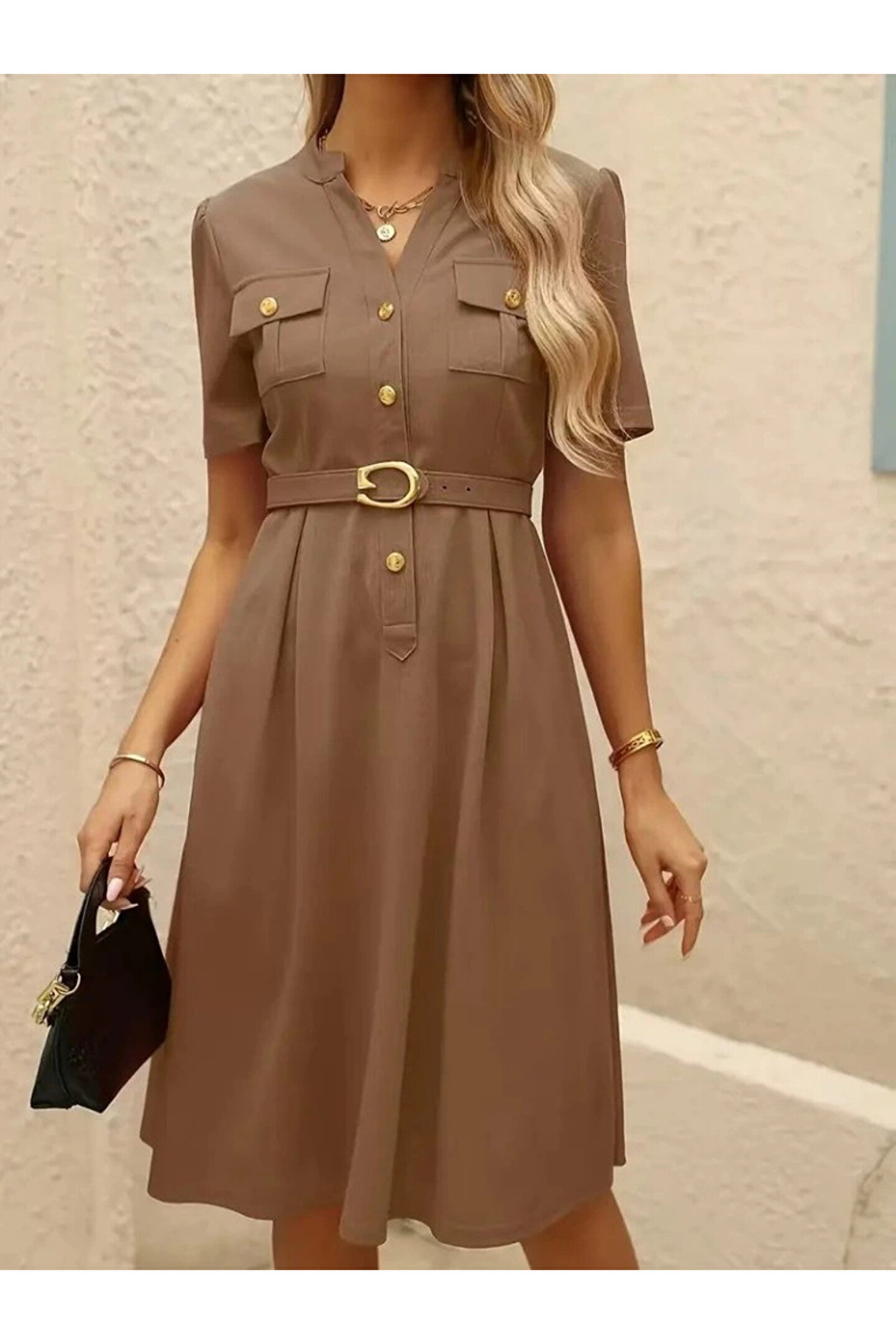 - Yaz aylarının vazgeçilmez parçası olan bu kadın kısa kollu elbise, hafif ve nefes alabilen örme kumaşıyla gün boyu konfor sunar.; - Sürdürülebilir malzemeler kullanılarak üretilmiş olup, çevre dostu bir tercih yapmanızı sağlar.; - Vücudu sararak feminen bir siluet oluştururken, kemer detayı belinizi zarifçe vurgular.; - Pratik çift cepli tasarımı ile günlük eşyalarınızı yanınızda taşımanız için idealdir.; - Klasik koleksiyonun sadeliğini yansıtan düz deseniyle her ortamda şıklığınızı korumanız mümkündür.; - İnce yapısı sayesinde sıcak yaz günlerinde serin kalmanızı desteklerken, dar kesimi modern bir görünüm kazandırır.; - Gömlek yakası ve kısa kol detaylarıyla hem rahatlık hem de stil sahibi bir duruş sergiler.; - Astarsız oluşu hafifliği arttırarak hareket özgürlüğü tanırken, klasik tarza uygunluğuyla zamansız bir parça haline gelir.