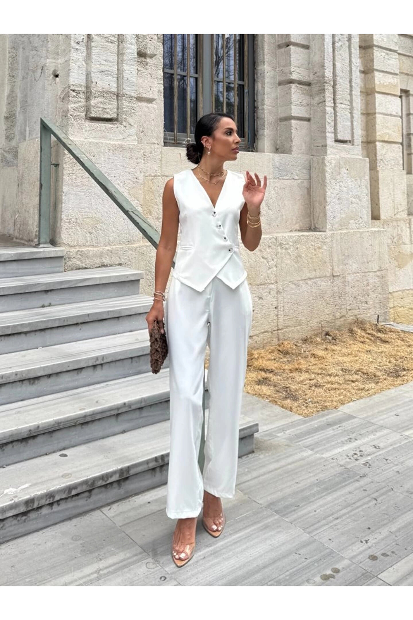 Kadın Sıfır Kollu çapraz V Yakalı önden Düğmeli Atlas Yelek Ve Pantolon Ikili Takım