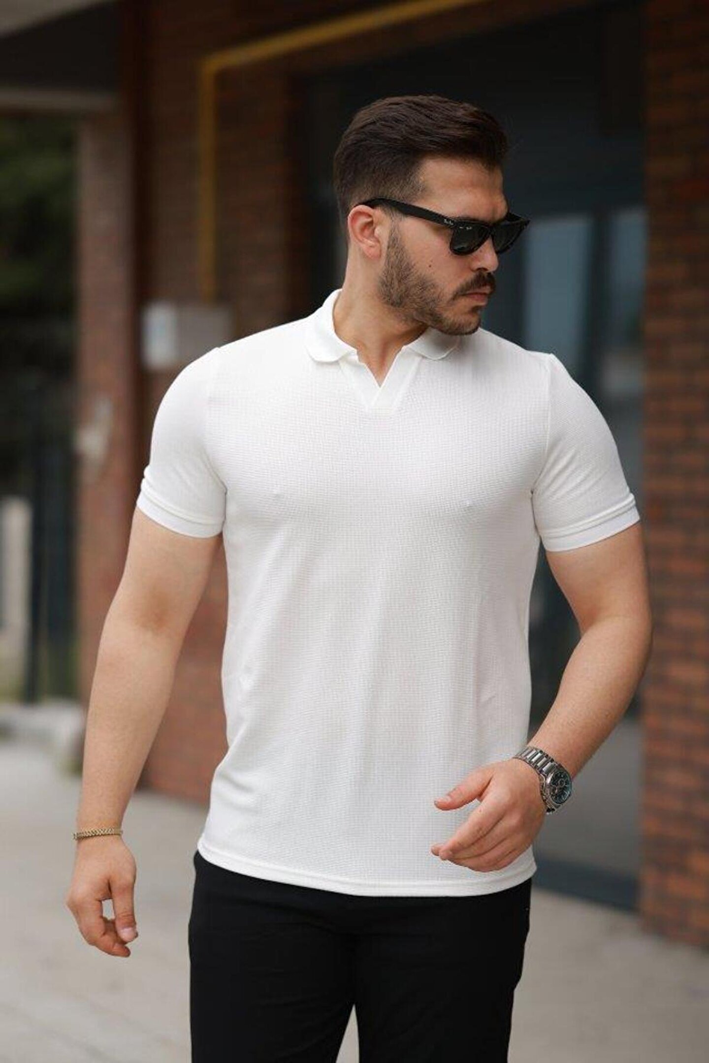 Erkek Yakalı Waffle Dokulu Kısa Kollu Tişört