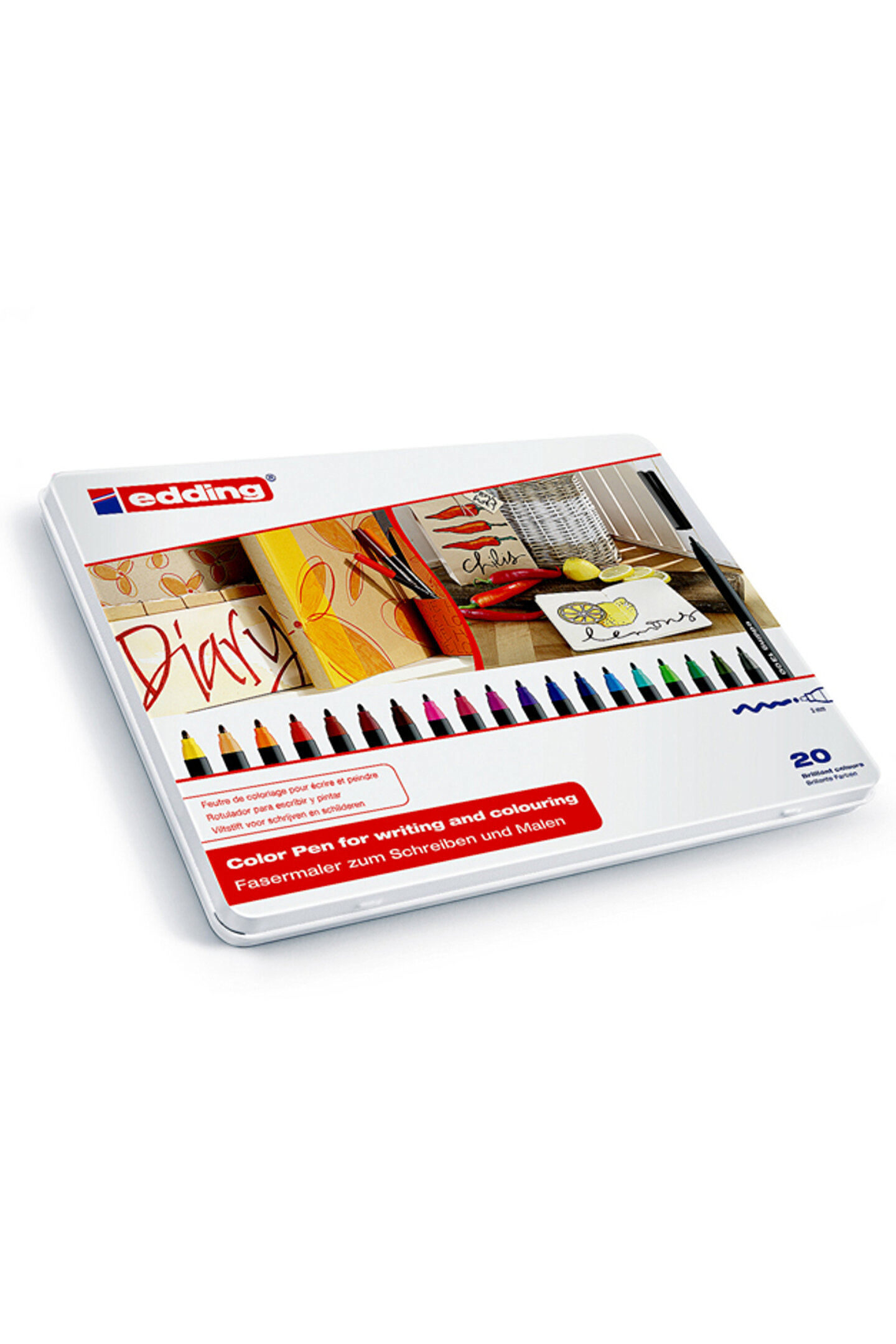 Renk zenginliği Edding 1300 keçeli kalem Kalemin pigment mürekkebi su bazlıdır Uç kalınlığı 2 mm Yuvarlak uç 20 renk