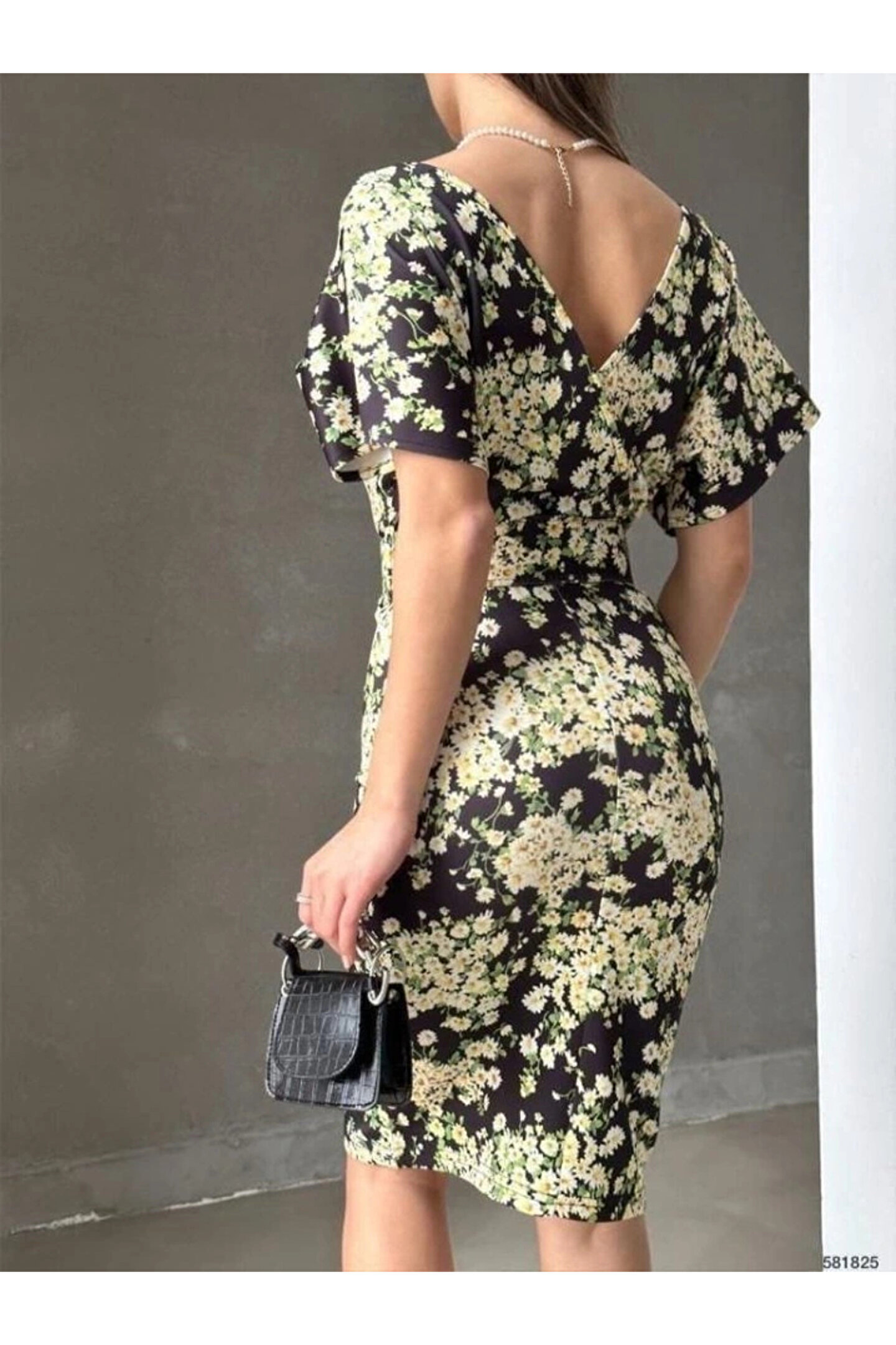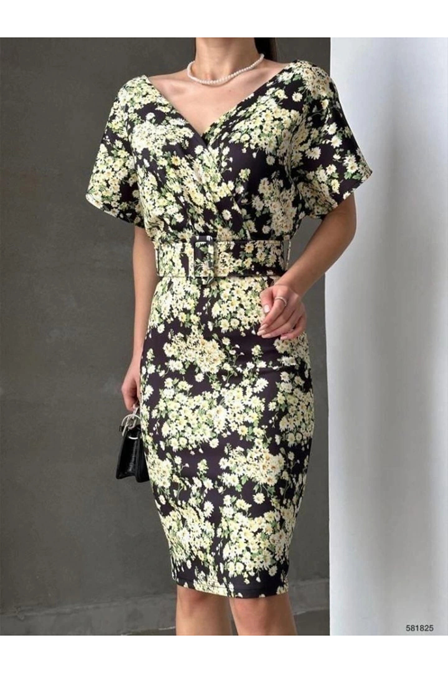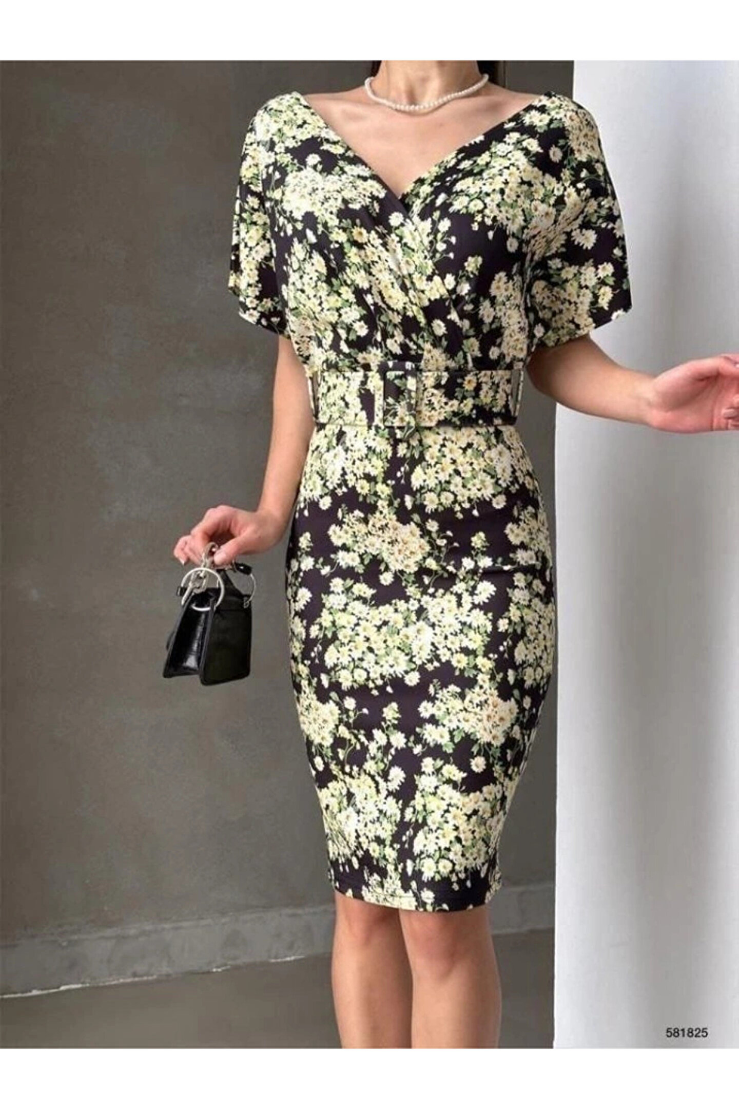 Kadın Dalgıç Kumaş V Yaka çiçek Desenli Kuşaklı Kalem Elbise